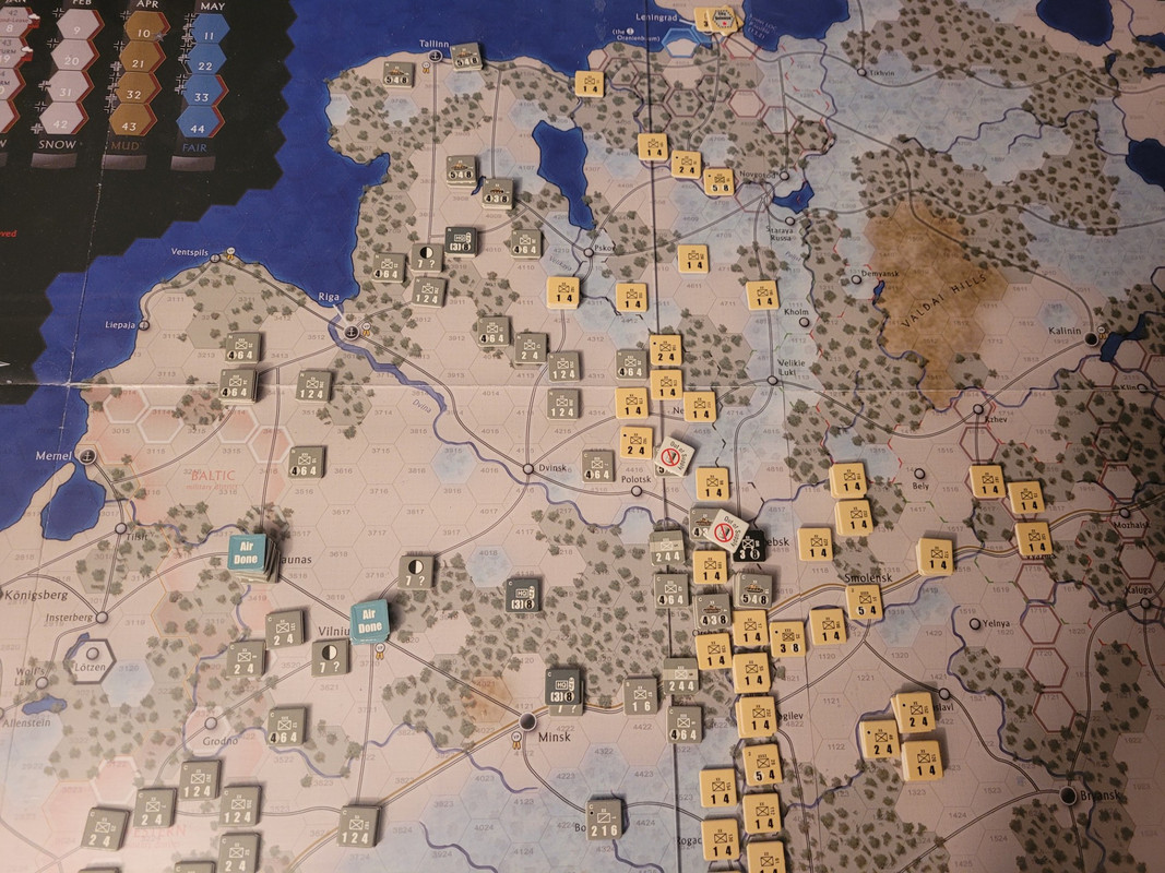 Operation Barbarossa inleds den 22 juni 1941. Luftwaffe angriper det sovjetiska flygvapnet och etablerar luftherravälde. De tre armégrupperna inleder sina anfall mot en totalt förvirrad motståndare. Spelet skildrar det genom att ge tyskarna en lång rad aktiveringar och sovjeten väldigt få. Effekten blir Barbarossa, inte minst gillar jag att man faktiskt kan ta sig över Dvina och ta Minsk redan första turnen, något som inte brukar gå i andra spel på samma tema.