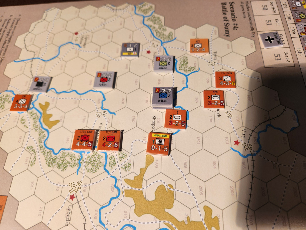 Miniscenario. Slaget om Sumy 28 sept-6 okt, 4 GT bara. Kievfickan är likviderad. Taifun börjar om några dagar och XXXXVIII pzkåren ska åter till 2 pansargruppen. Den ska dockinte ta vägen rakt norrut tillbaka som den kom söderut. Istället ska de anfalla mot nordost in i luckan mellan 40 armén och 13 armén (norr om spelområdet både på minikartan och hela spelet). Ryssarna har dock också sett luckan och den 27 sept kommer Belovs andra kavallerikår på plats.