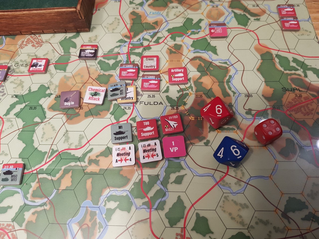 Fulda alltså. Angreppet kommer som en överraskning och 11ACR är i barrackpositionerna när angreppet inleds (inte i primary terrain). 8GA inleder med en kemisk missilattack som träffar jänkarna och tillfogar dem hundratals personalförluster (-1 inf step). 11ACR intar förplanerade ställningar (dug in) och inväntar stålstormen.  Tack vare några tyska hemvärnsmän så sinkas invasionen och trots att ryssarna når fram med ett par divisioner så hinner man bara med en Meeting engagement - den stridsform som kostar minst mp, ger mest exploit men som ger sämst modifikationer och sämst understödseffekt. Hm. Ryssarna anfaller.