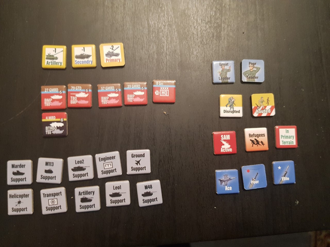 Ni får ursäkta bildens erotiska belysning, här ser ni dels grafiken och dels enheter. Enheterna har inte värden, däremot storlek (den vita trean i svart cirkel). Divisioner har sex i storlek. Sedan finns det info om enhetens primära och sekundära utrustning, till exempel M60 och M113. Av dessa utrustningstyper kan man välja att sätta in den man vill i en given strid, dom är olika bra i olika terräng och en enhet har begränsad mängd trupp, primär och sekundär utrustning (som man håller ordning på separat). Det finns ingen CRT utan man slår en varsin tärning och lägger till storleksmodifikationer och alla supportfunktioner och drar en bricka (beroende på anfallsmetod, finns fyra olika sorters alternativ) som anger modifikation, tärningstyp, random events och exploitfaktor. Det kanske låter bökigt men är inte alls särdeles jobbigt - men det ger en väldigt taktisk känsla till ett operationellt spel. Jag kommer med ett exempel nedan.