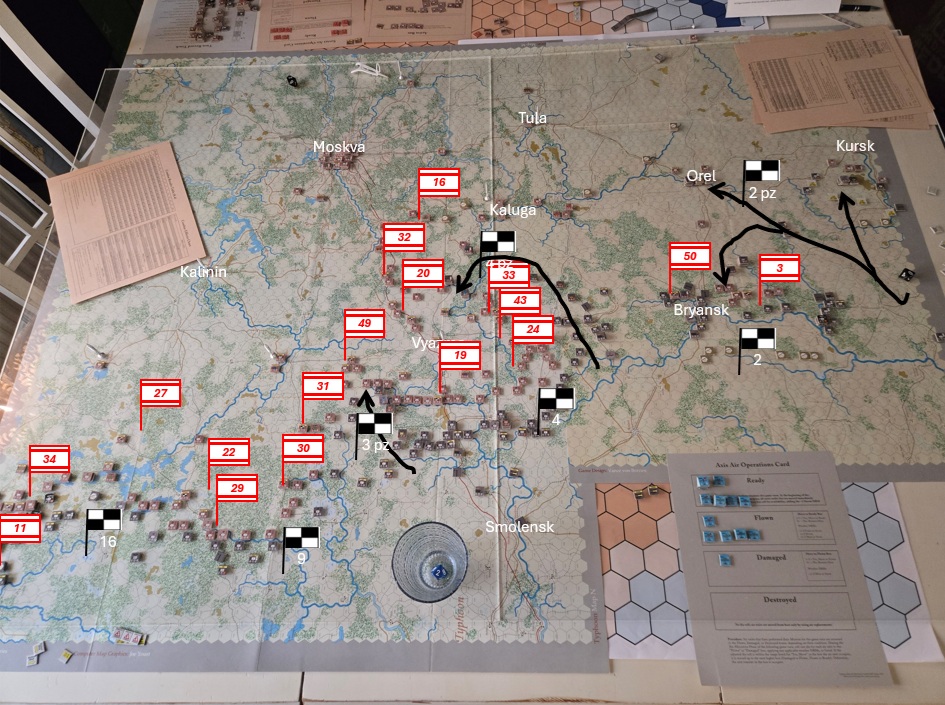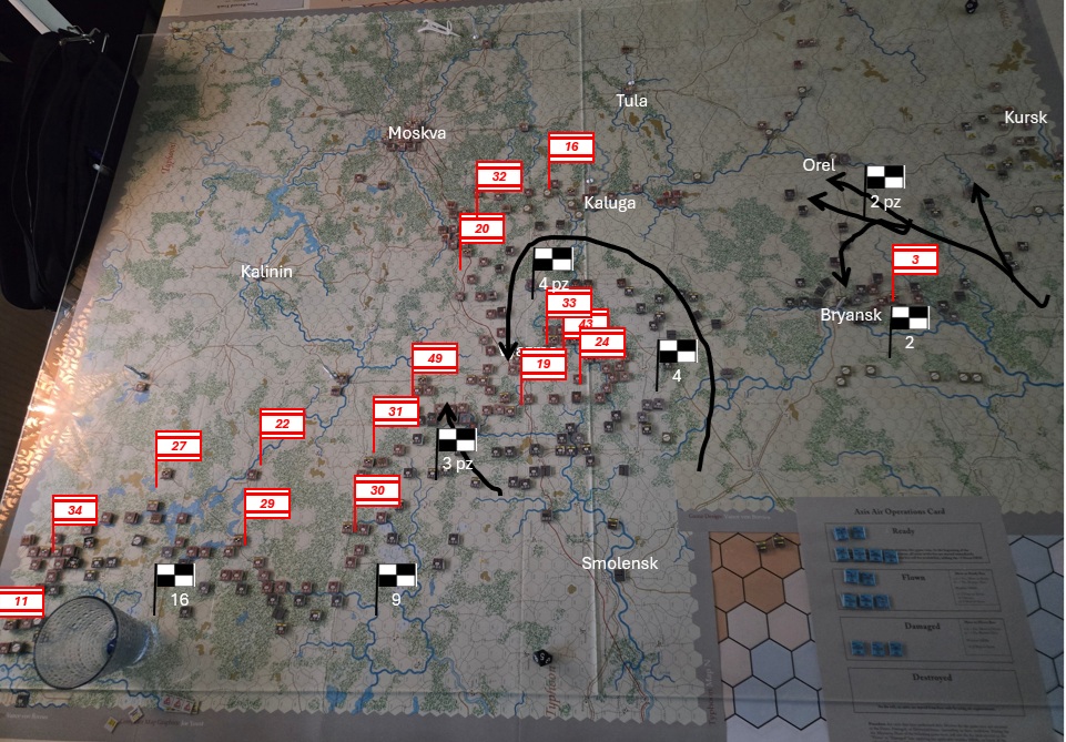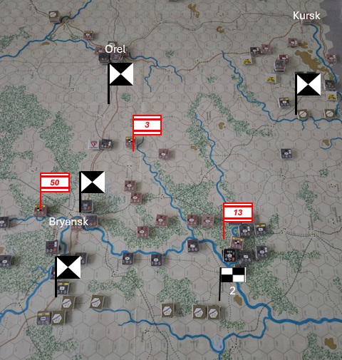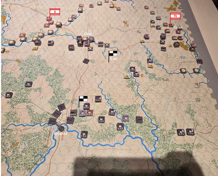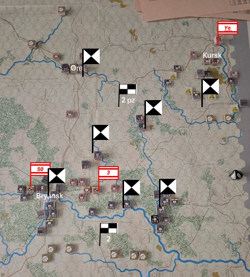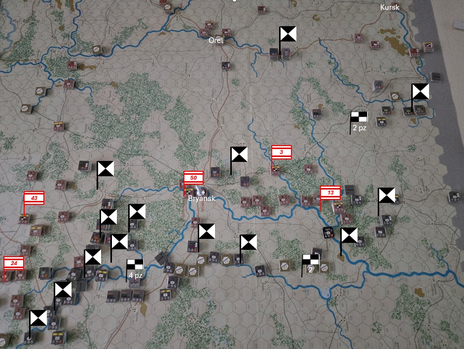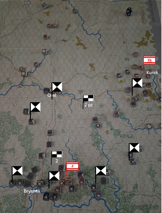 Efter 4 dygn (2 GT) har Guderians 2 pansargrupp (inte helt överraskande) fått till ett totalt genombrott och täten, 3 pansardiv) har nått drygt halvvägs till Orel. 3 och 13 sovjetiska arméerna drar sig bakåt mot nord ost så fort de kan, men det ser inte lovande ut.