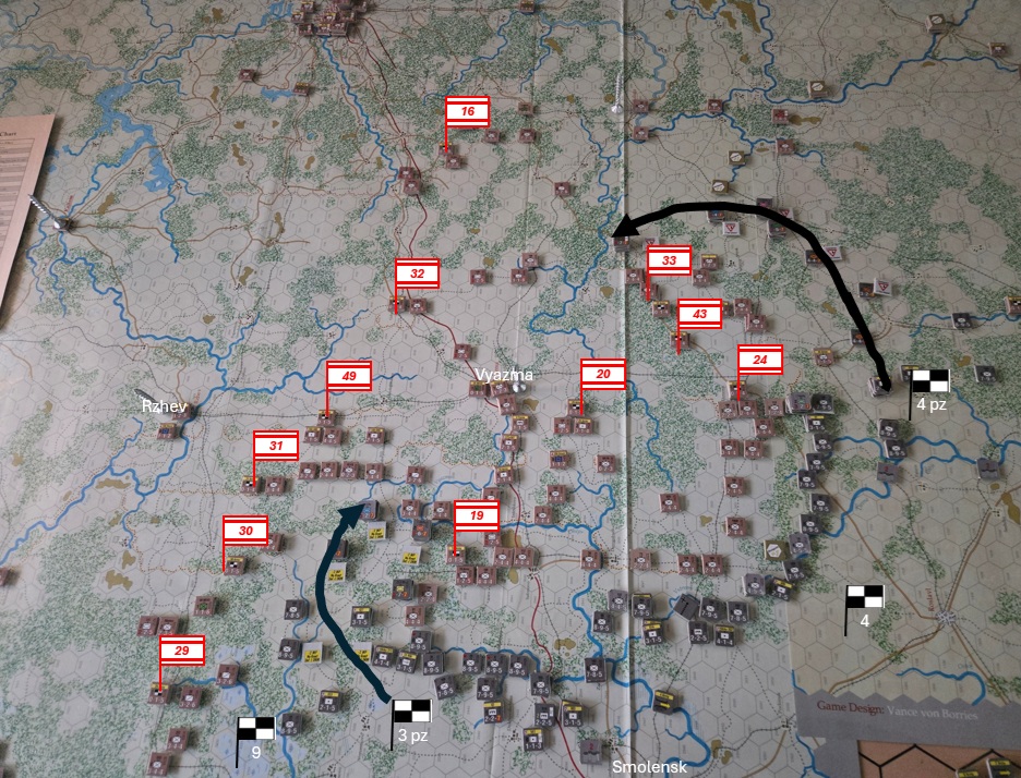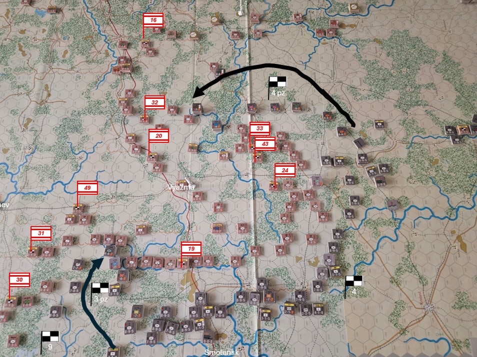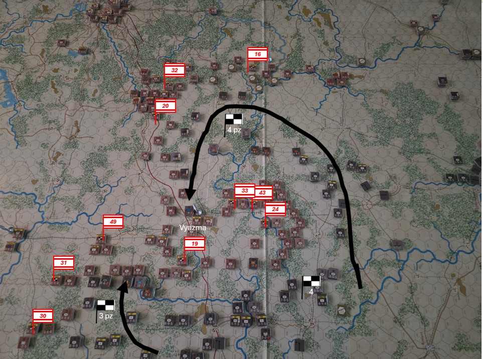 I centern vinklar 4 pansargruppens tät österut och nåt Viazma från öster. 3 pansargruppen rör sig bara marginellt framåt.