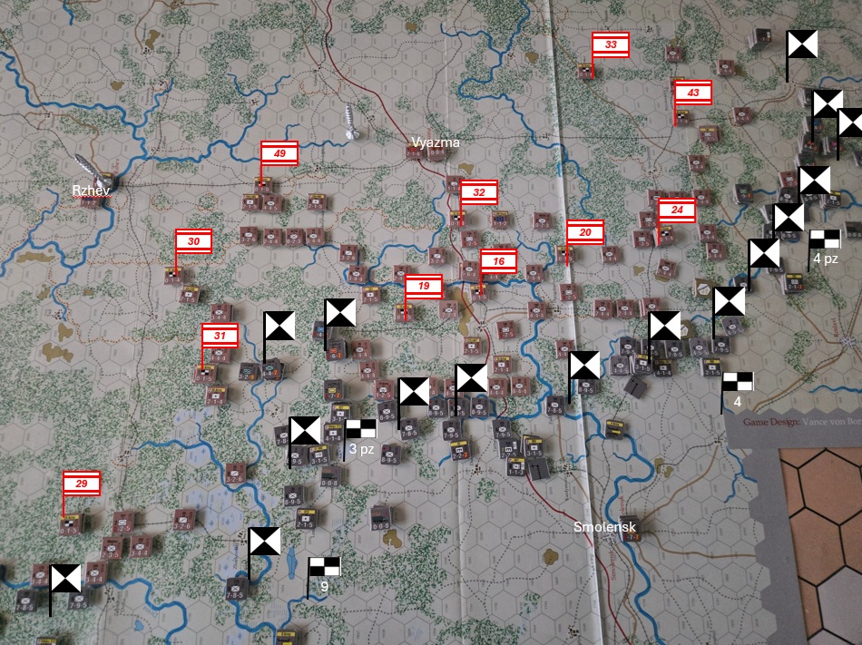 Nu slår regn och gyttja till. Tyskarna står i princip helt still. 3 pansargruppen lyckas med en serie anfall ta sig över en befäst vattendragslinje, vilket är viktigt, men det syns knappt på bilderna. 2 hex framåt ju bara. Även den ryska urdragningen ur Vyazmafickan går långsammare.