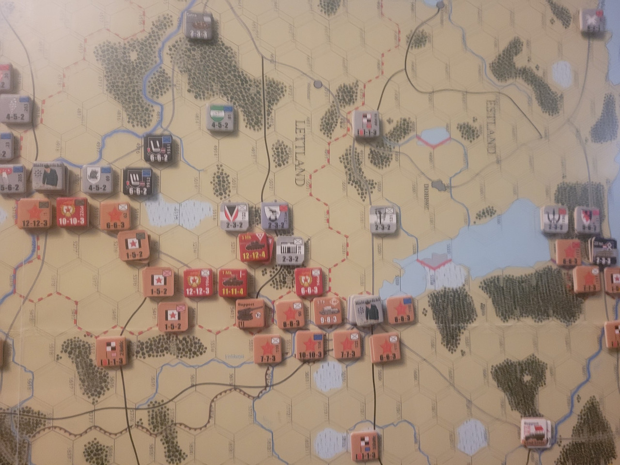 I norr händer något oväntat. Ryssen får in maximalt antal supports och kan lika gärna anfalla. AGN har dragit ut trupper hela sommaren och när nu hammarslaget faller så finns det inget operationellt djupt alls, bakom linjen är det helt tomt. Ryssarna grupperar 4 tank-kårer från Stavkan och linjen bryts på flera ställen. Pskov isoleras och nu är det baltisk kollaps på menyn. Det underlättade inte alls att tyskarna hade halv förflyttning pga ny chef, här vet jag inte alls var nästa linje kommer vara. Riga?