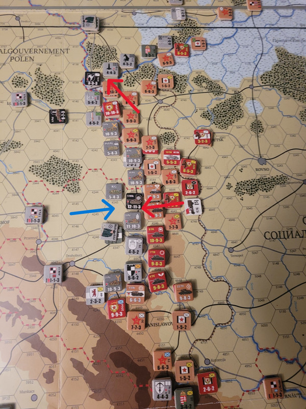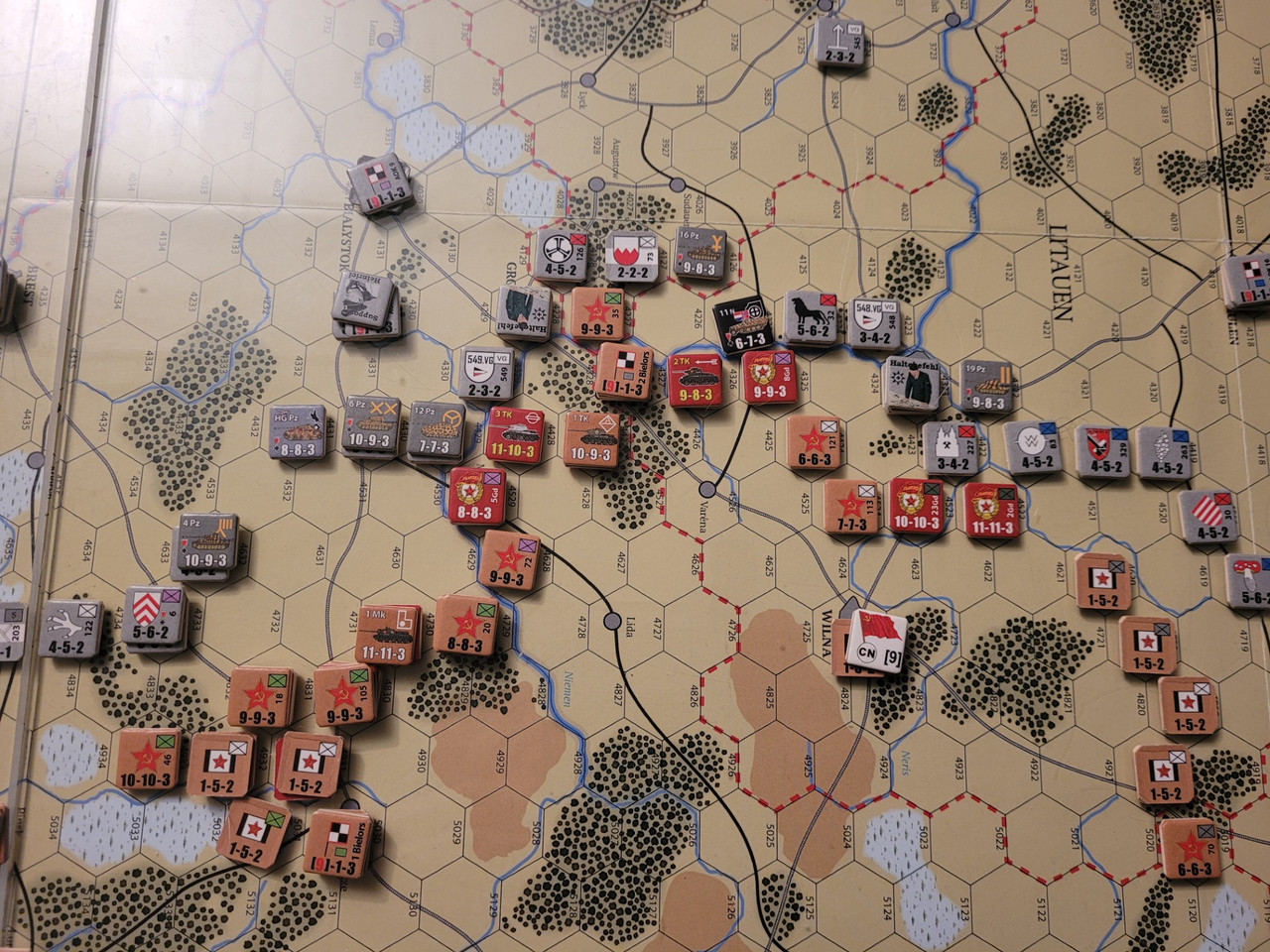 I södra Polen har det ta mig djävulen gått troll i den sovjetiska offensiven. Jag har slagit som en kratta, det finns nu en hel straffbataljon som bara består av sovjetiska överstar och generaler som inte kunnat slå över 6 på 2D6 på flera månader. Deras barn är sålda till mongoliska nomader och deras fruar ska putsa den transsibiriska järnvägen med tandborstar!