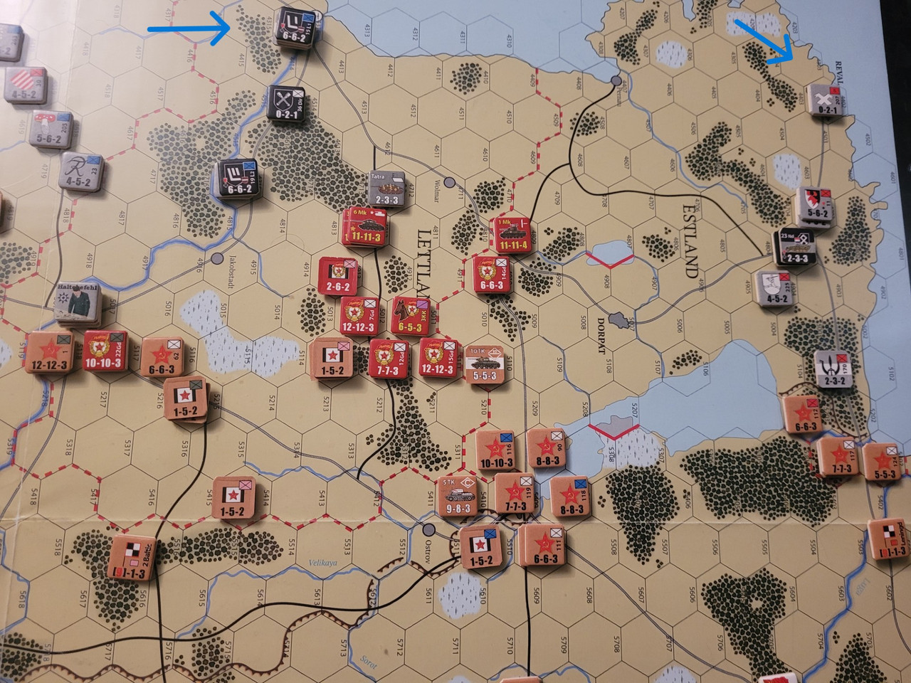 Återigen är det den norra fronten som begagnar sig av den korrekta Marxist-Leninistiska anfallsmetoden och fullkomligt pulvriserar sin motståndare. Man erövrar Pskov, slår ut ett arméhögkvarter och besegrar alla de tyska divisioner man hamnar i strid med. Styrkan uppe vid Narva kastar sig mot Tallin och övriga divisioner kastar sig mot Riga (blå pil). Jag inser att det här är väl typ OCS Baltic Gap som utspelar sig. Här kommer enbart den haltande logistiken stoppa upp ryssarna, genombrottet är så totalt så det är omöjligt att få till en linje.