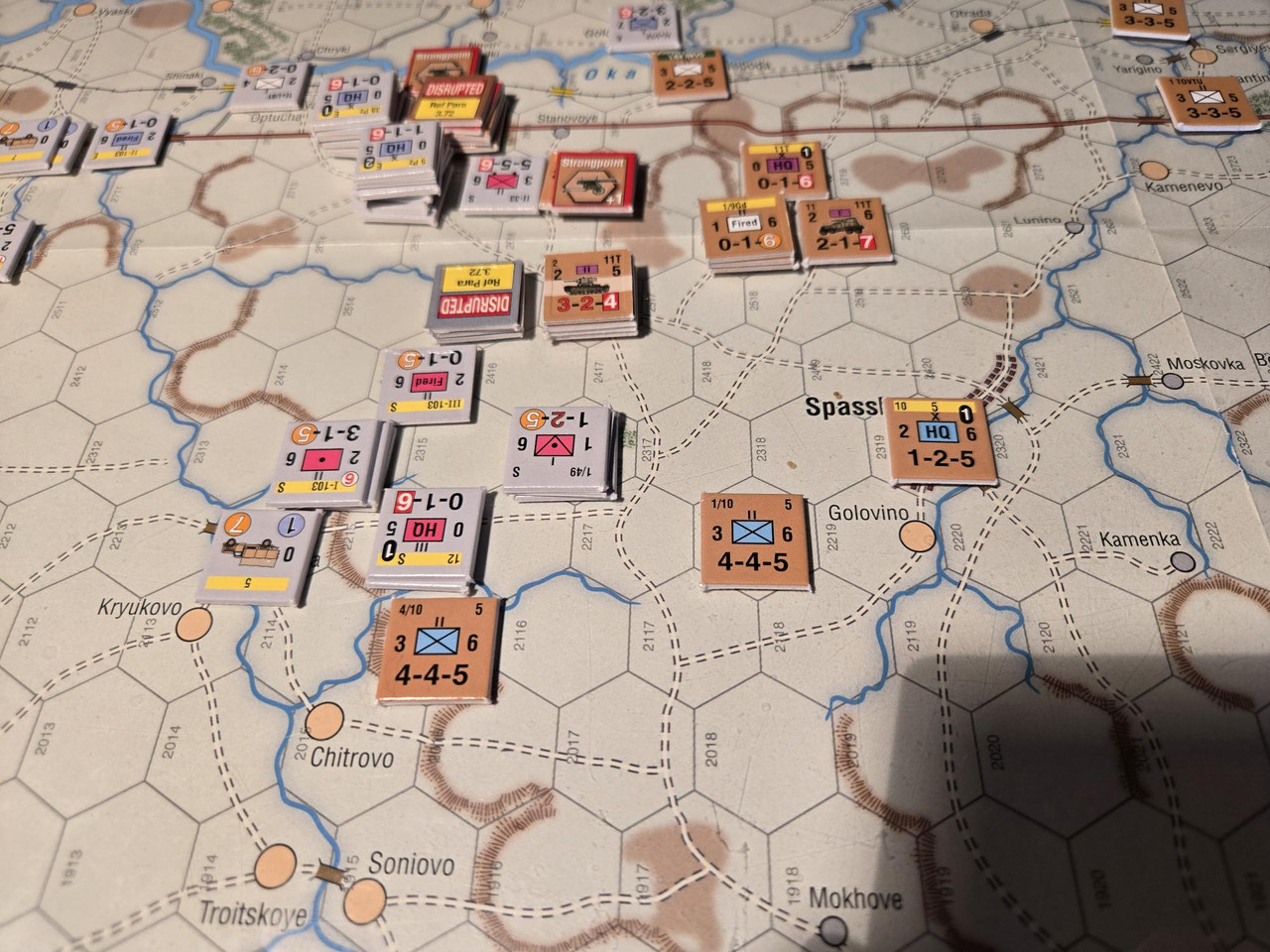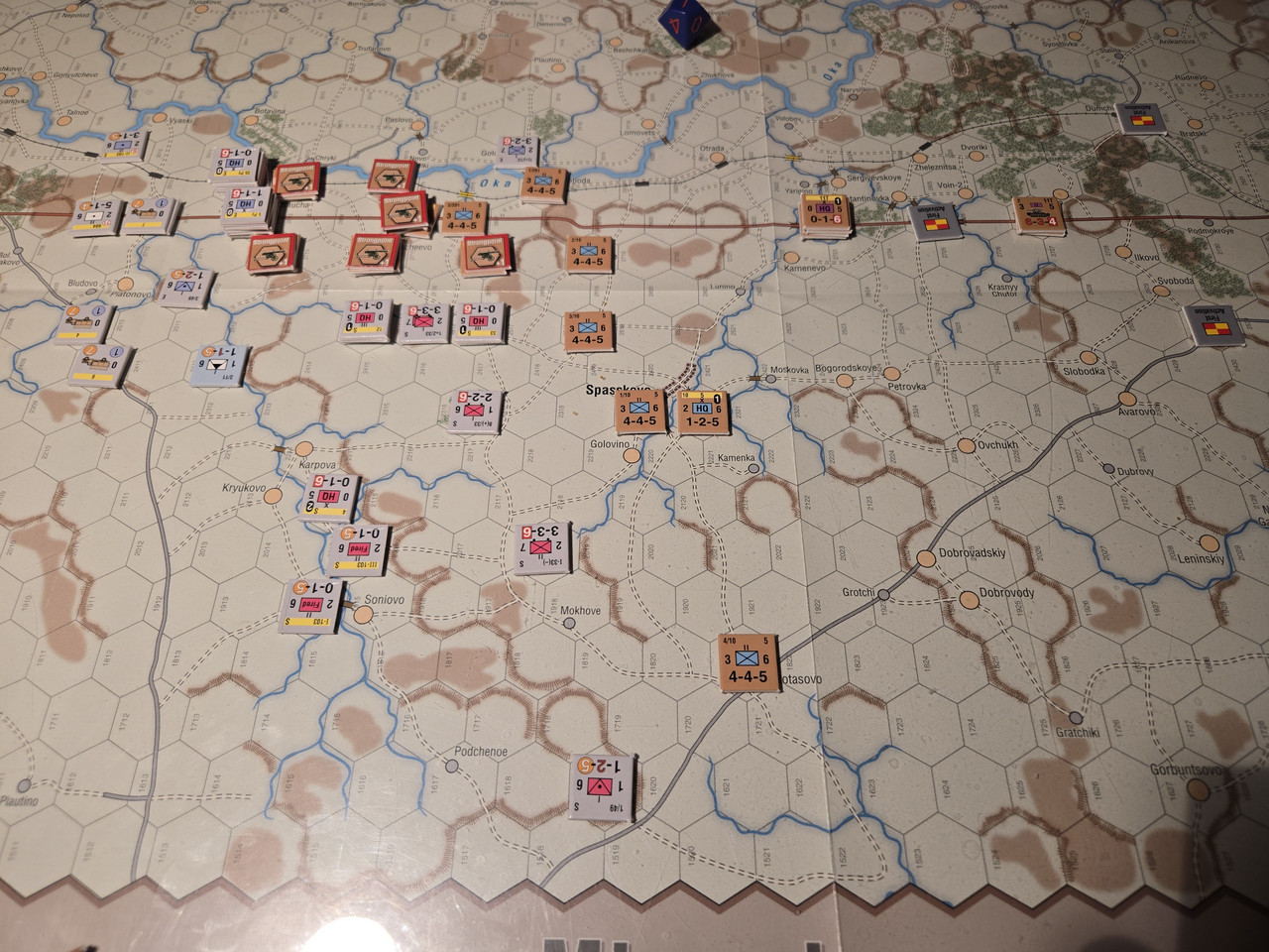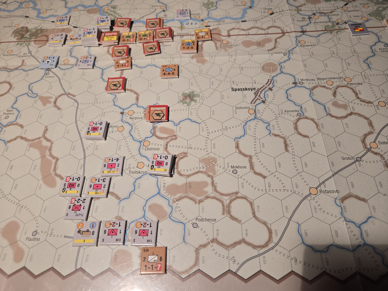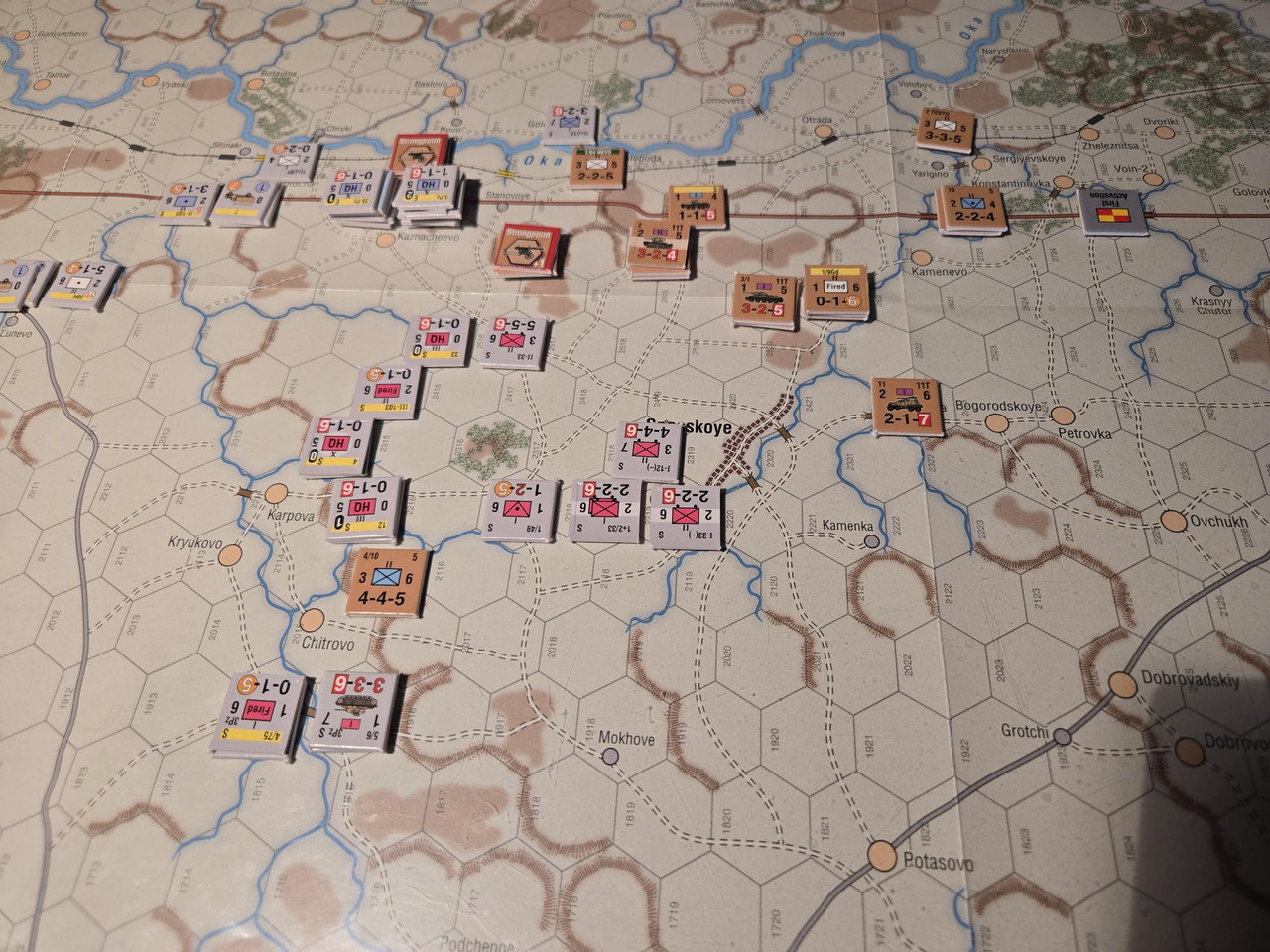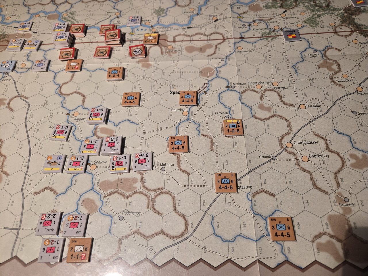 KG Eberbach tar sig an nästa motståndsnäste. Utfallet blir 10 igen. Åter ömsesidiga step loss. Det här nöter ner Eberbach i alarmerande takt. Men det motoriserade skyttekompaniet som varit på andra sidan ån Oka går över och anfaller en rysk haubitsbataljon och uppnår tydligen total överraskning och nedkämpar den. Samtidigt skär man av den ryska underhållslinjen. 4 pansar skakar fram en bataljon BT-5 ur bakre linjen och ett MC-kompani som går till motanfall, men tyskarna är tydligen beredda och slår tillbaka dessa.
