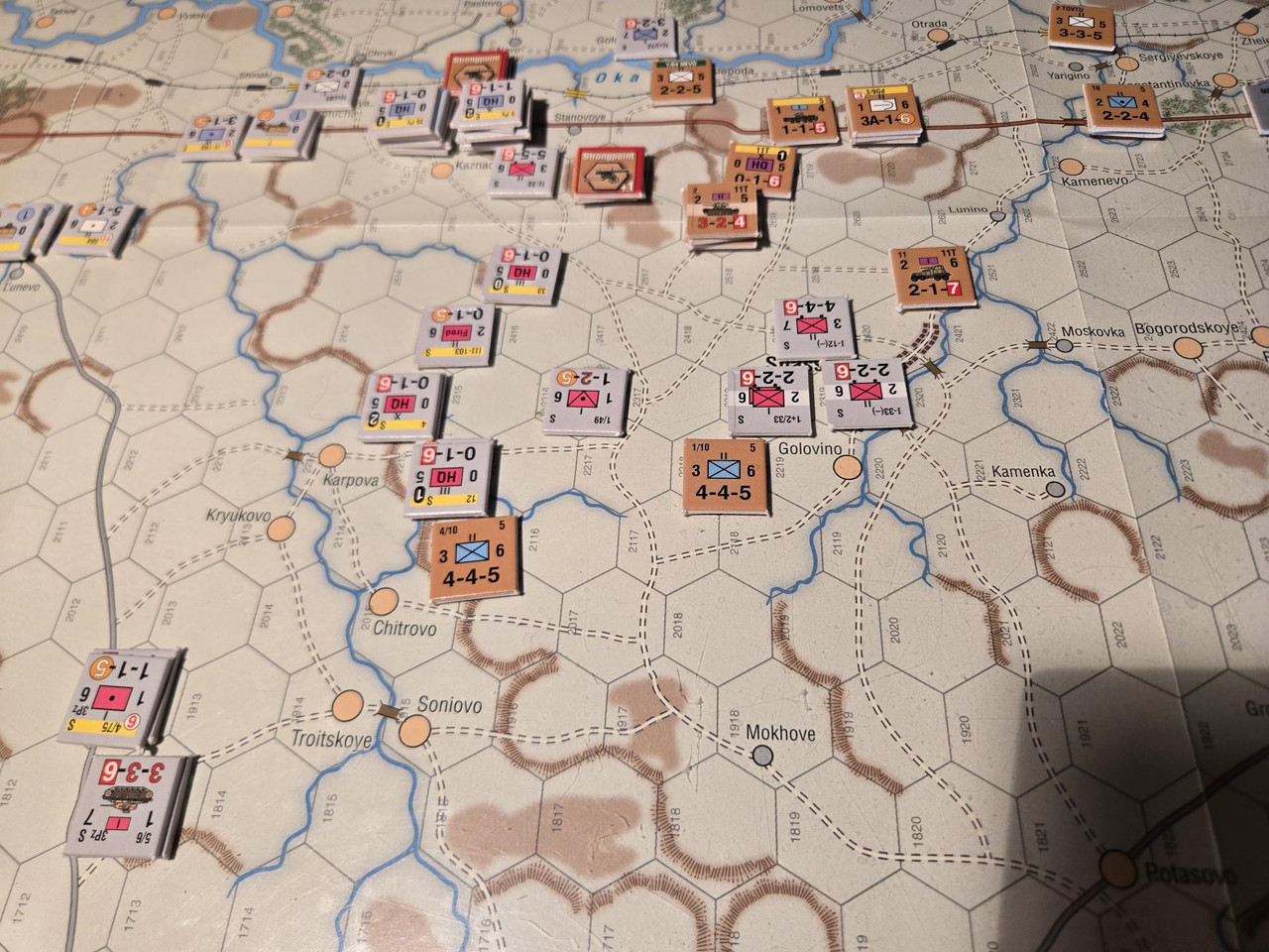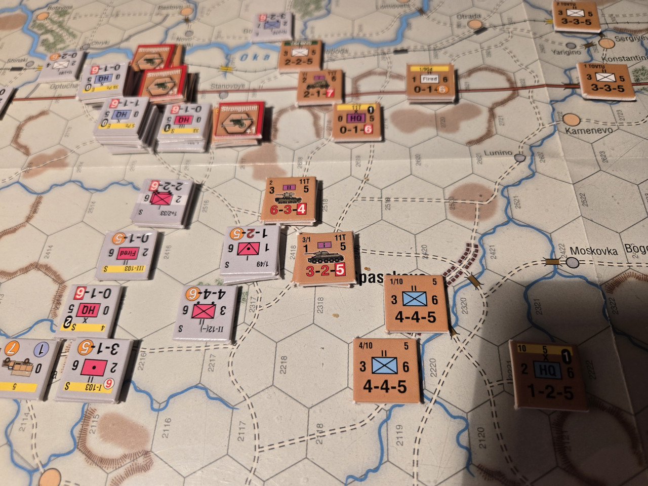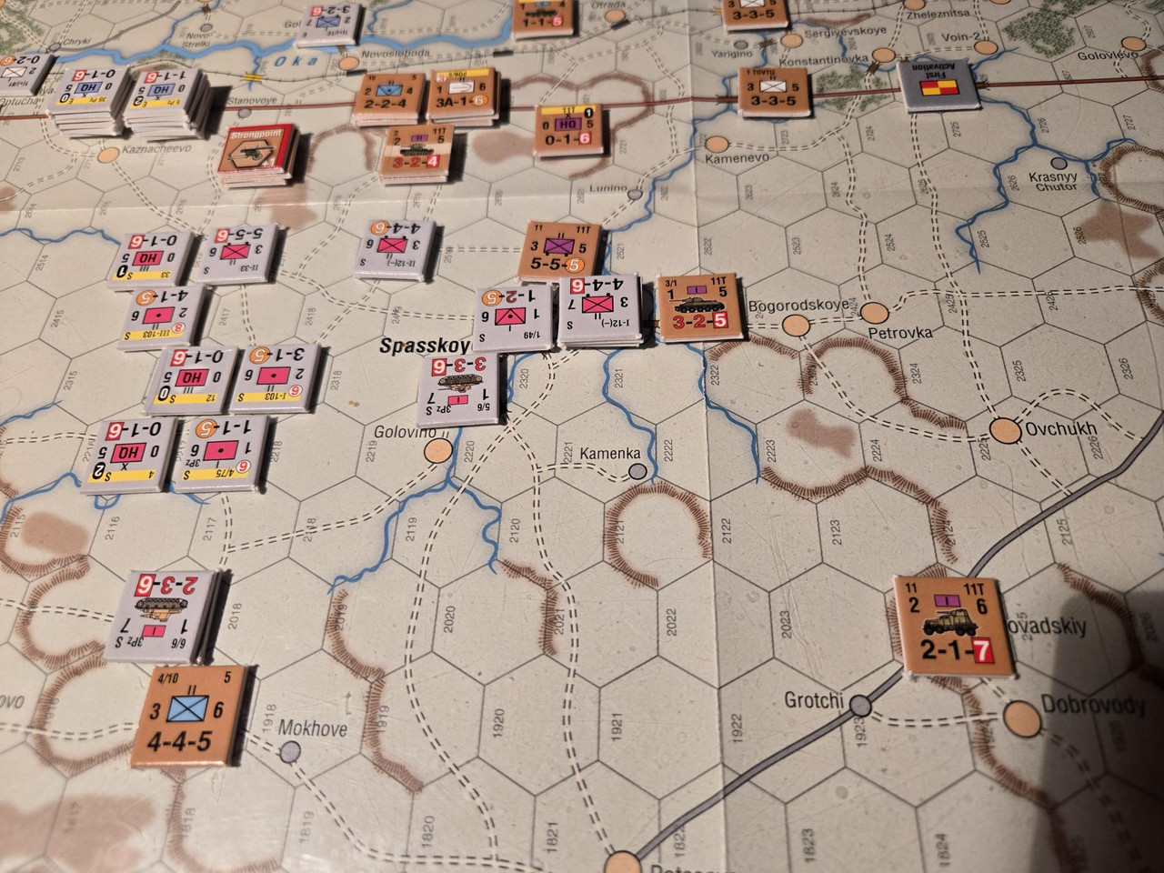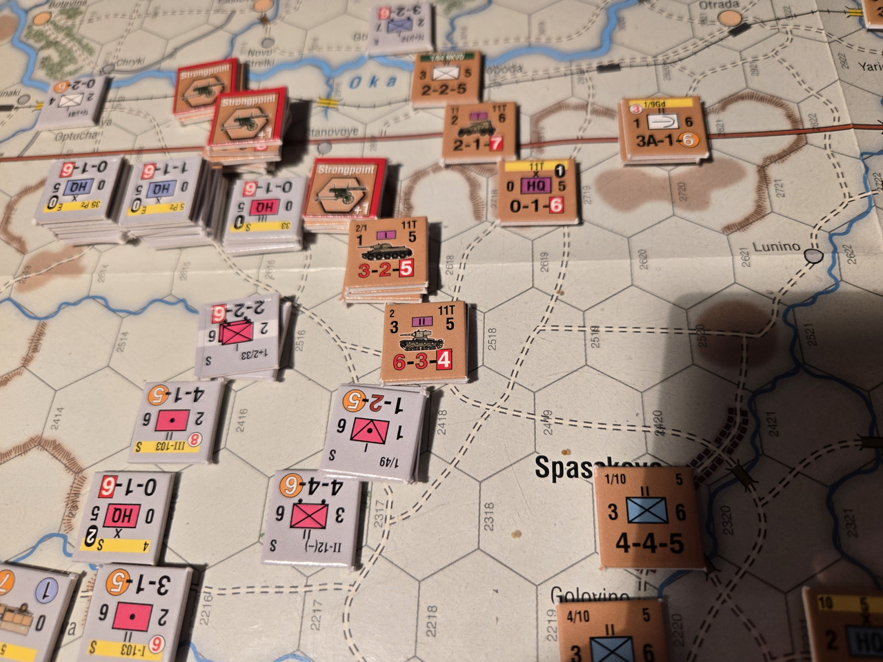 KG Eberbach tar sig an nästa motståndsnäste. Utfallet blir 10 igen. Åter ömsesidiga step loss. Det här nöter ner Eberbach i alarmerande takt. Men det motoriserade skyttekompaniet som varit på andra sidan ån Oka går över och anfaller en rysk haubitsbataljon och uppnår tydligen total överraskning och nedkämpar den. Samtidigt skär man av den ryska underhållslinjen. 4 pansar skakar fram en bataljon BT-5 ur bakre linjen och ett MC-kompani som går till motanfall, men tyskarna är tydligen beredda och slår tillbaka dessa.
