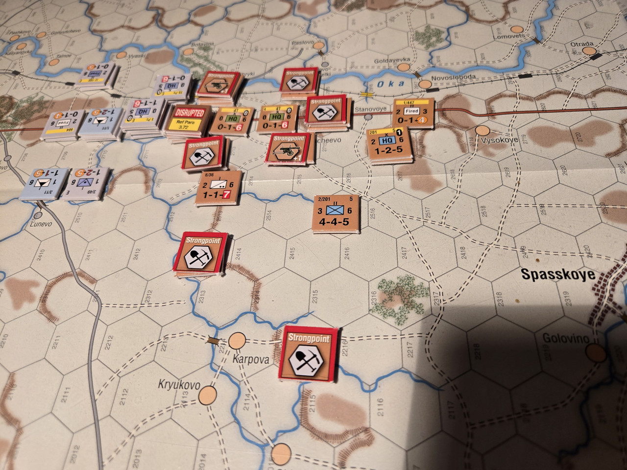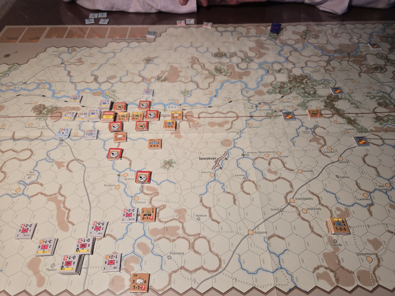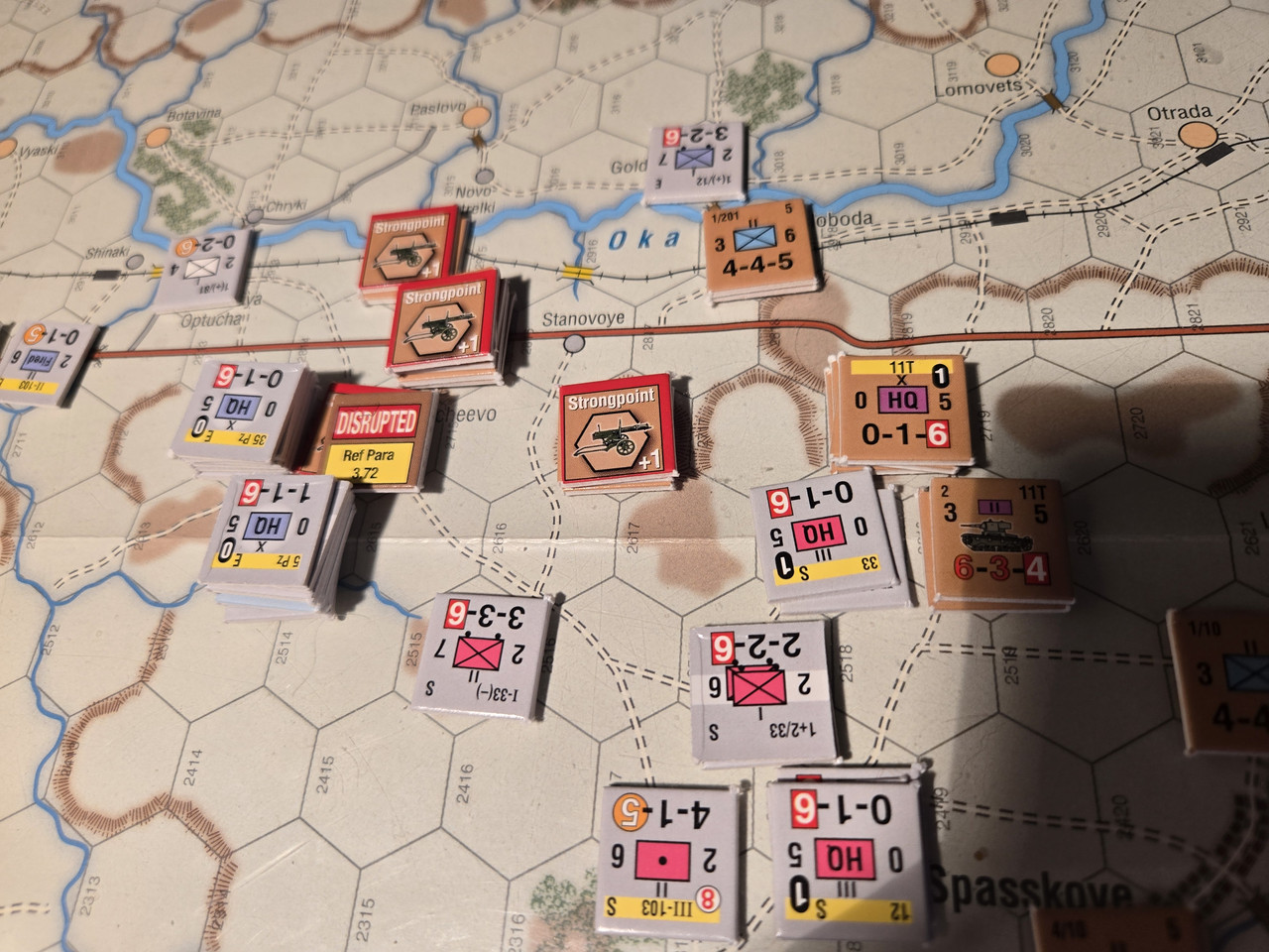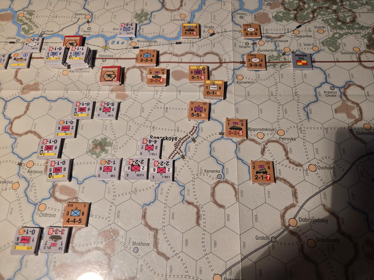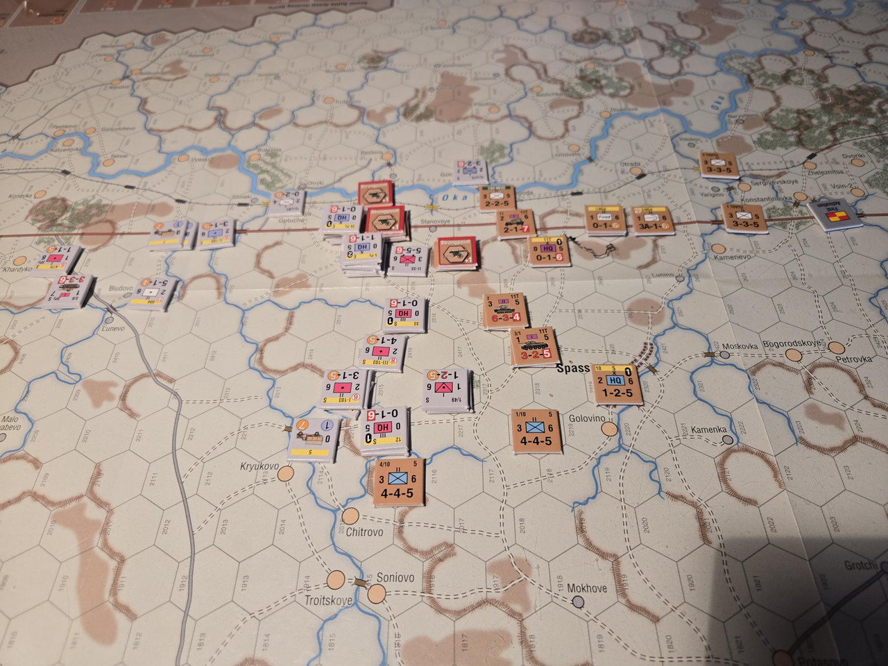 KG Eberbach tar sig an nästa motståndsnäste. Utfallet blir 10 igen. Åter ömsesidiga step loss. Det här nöter ner Eberbach i alarmerande takt. Men det motoriserade skyttekompaniet som varit på andra sidan ån Oka går över och anfaller en rysk haubitsbataljon och uppnår tydligen total överraskning och nedkämpar den. Samtidigt skär man av den ryska underhållslinjen. 4 pansar skakar fram en bataljon BT-5 ur bakre linjen och ett MC-kompani som går till motanfall, men tyskarna är tydligen beredda och slår tillbaka dessa.