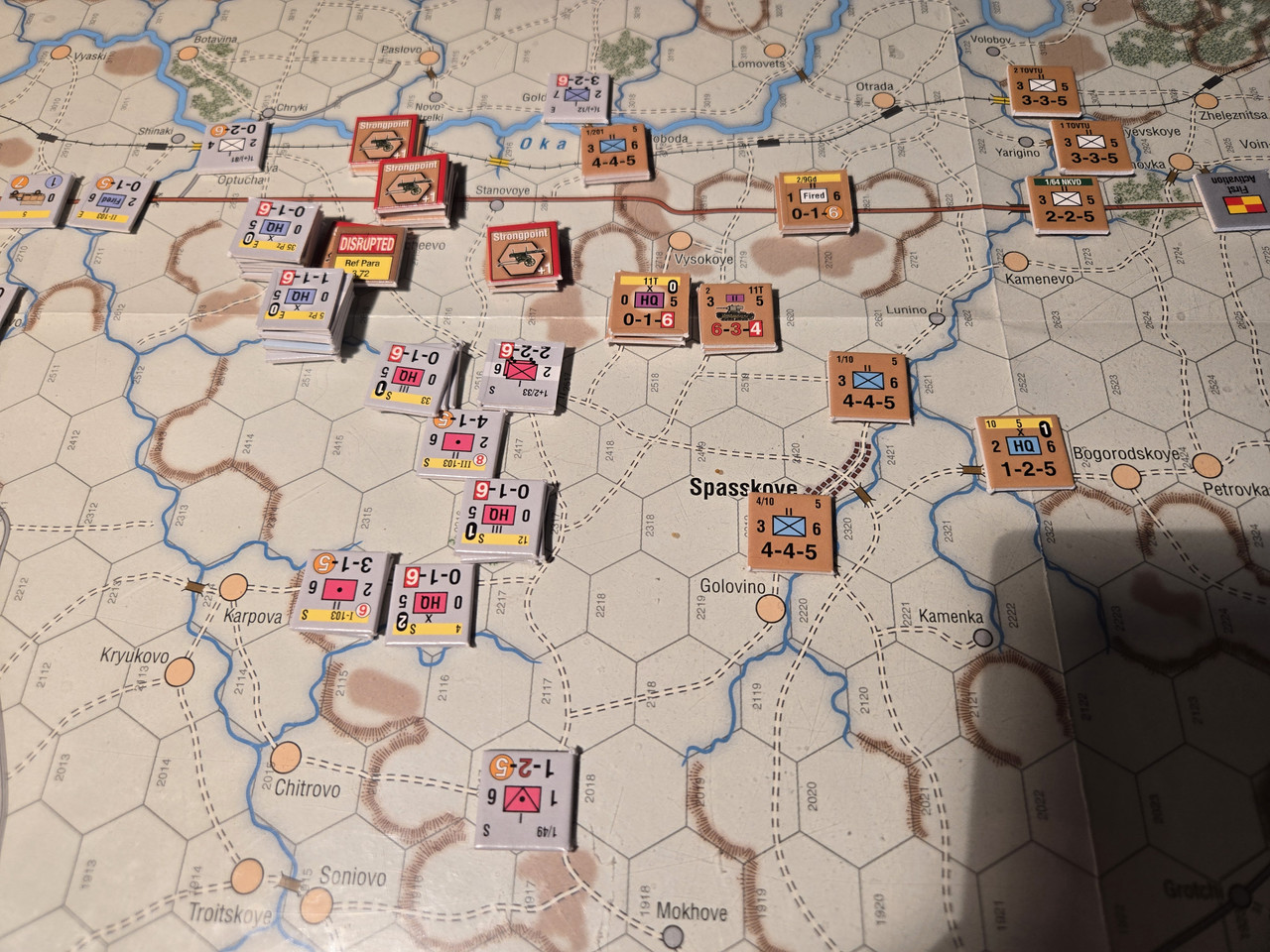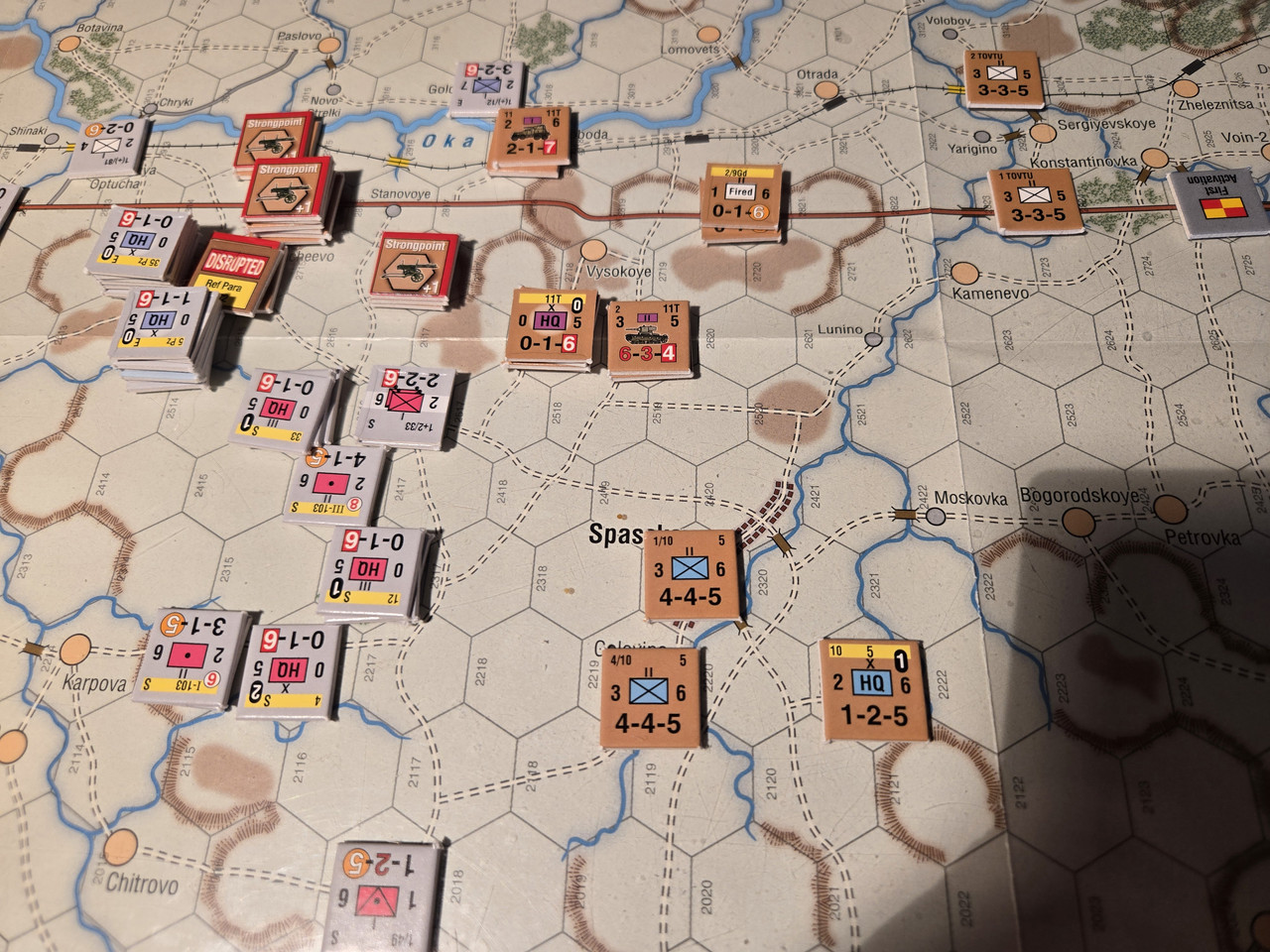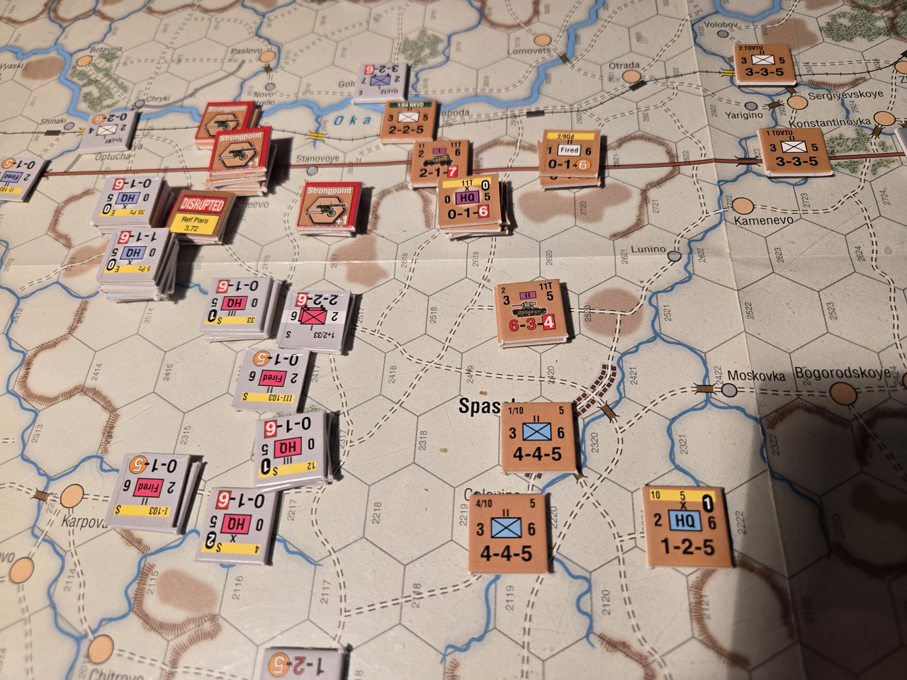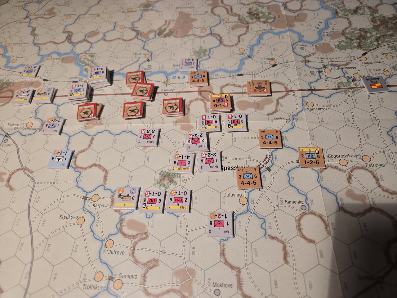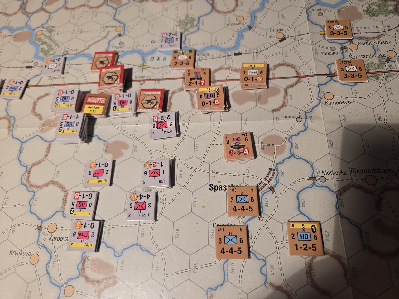 5 luftburna har inte mycket att agera med, men ställningen vid floden Oka överges till förmån för en ställning uppe på höjden som förstärks med pansarvärn. Ett kompani T-37 lätta stridsvagnar får bevaka bron längre norrut.