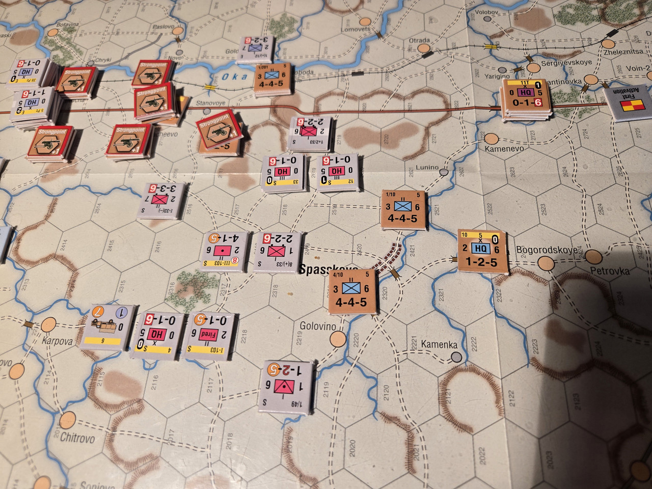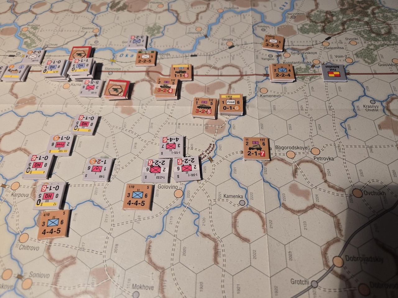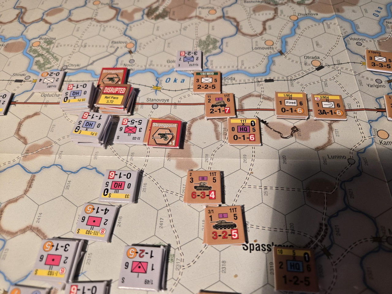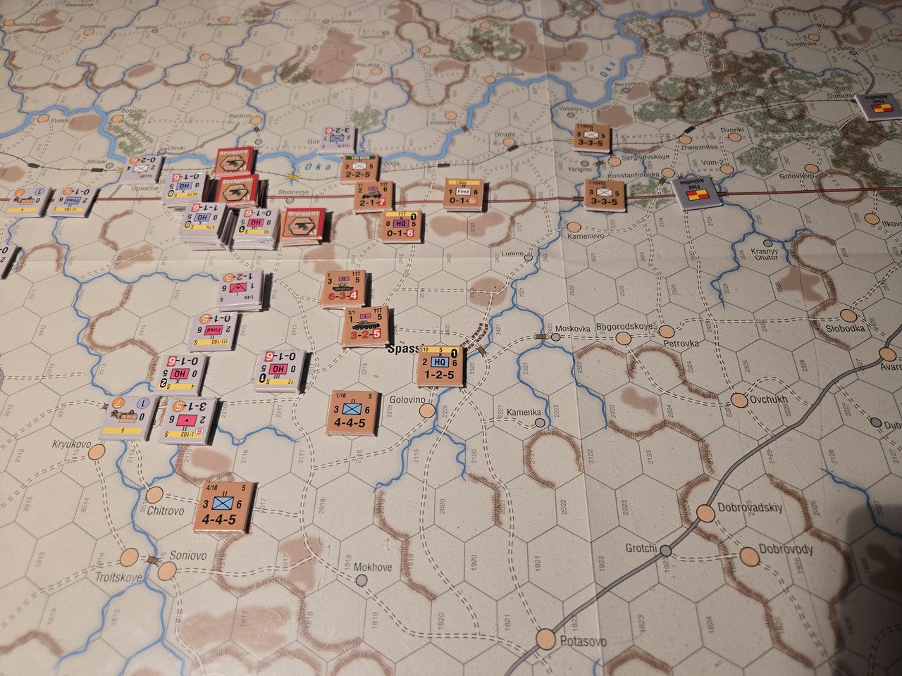 5 luftburna har inte mycket att agera med, men ställningen vid floden Oka överges till förmån för en ställning uppe på höjden som förstärks med pansarvärn. Ett kompani T-37 lätta stridsvagnar får bevaka bron längre norrut.