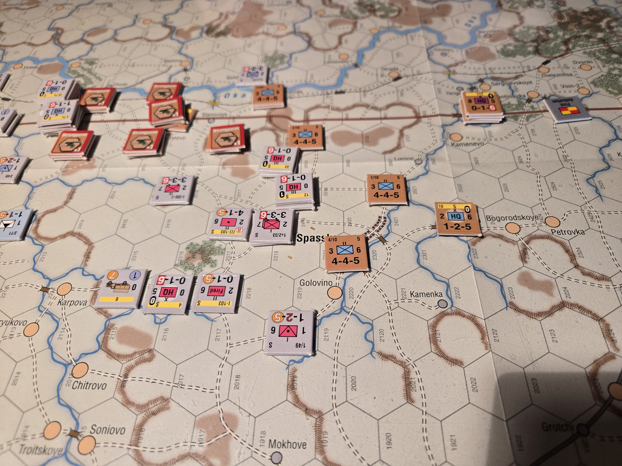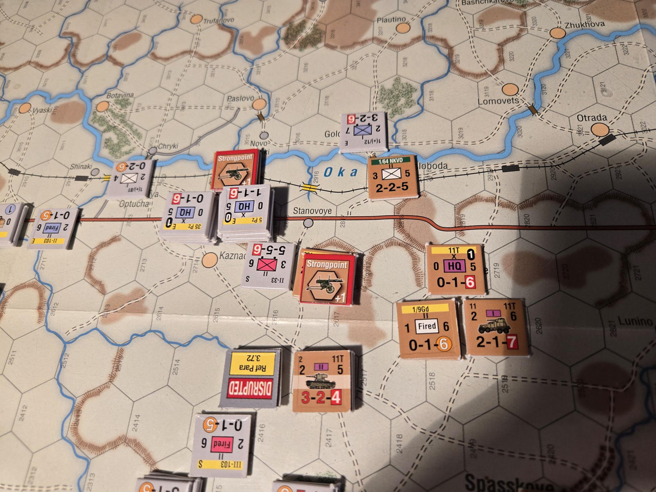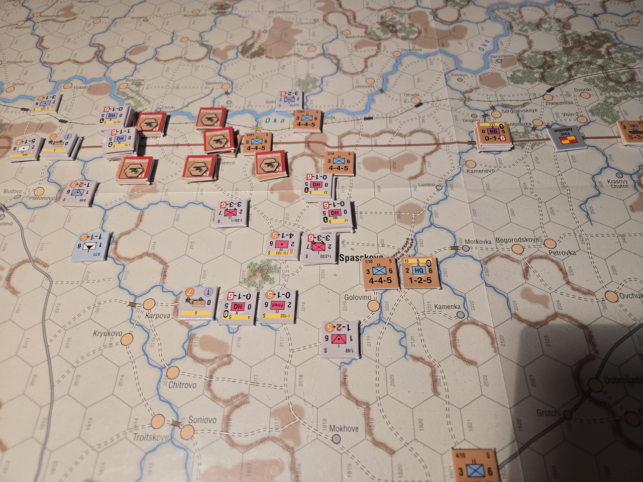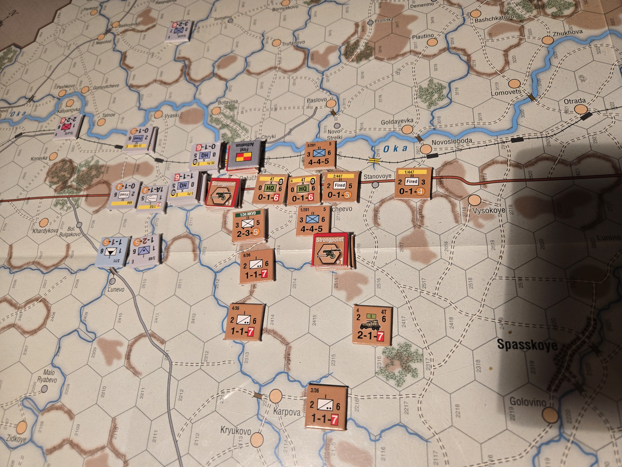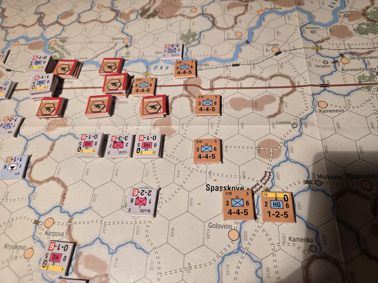 5 luftburna har inte mycket att agera med, men ställningen vid floden Oka överges till förmån för en ställning uppe på höjden som förstärks med pansarvärn. Ett kompani T-37 lätta stridsvagnar får bevaka bron längre norrut.