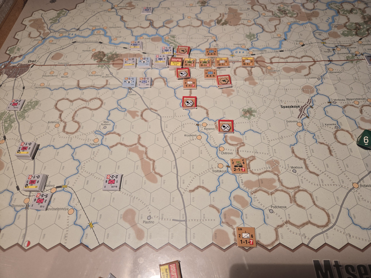 Tyskarna står i utgångsläge runt Orel i väsntra delen av kartan, som alltså togs nästan oförsvarat. Mtsensk ligger i högra delen av kartan.