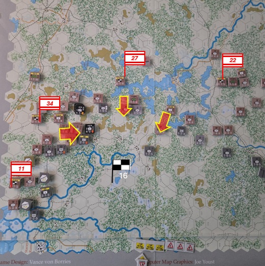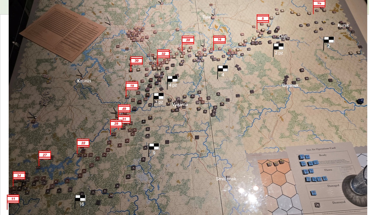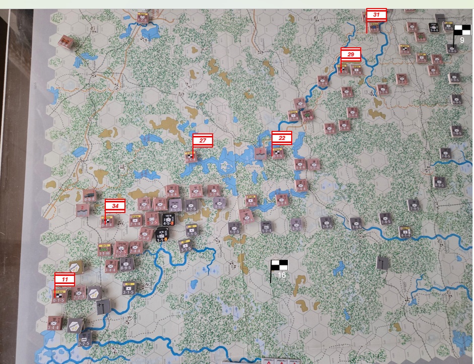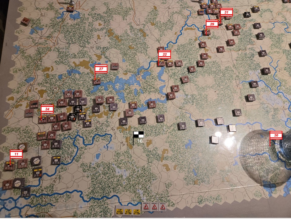 Den ryska offensiven tar ytterligare några hex i norr, men det kostar motsv två skyttedivisioner. 16 och 30 arméstaberna byter ansvarsområden. 16 är en väsentligt mer kapabel stab.