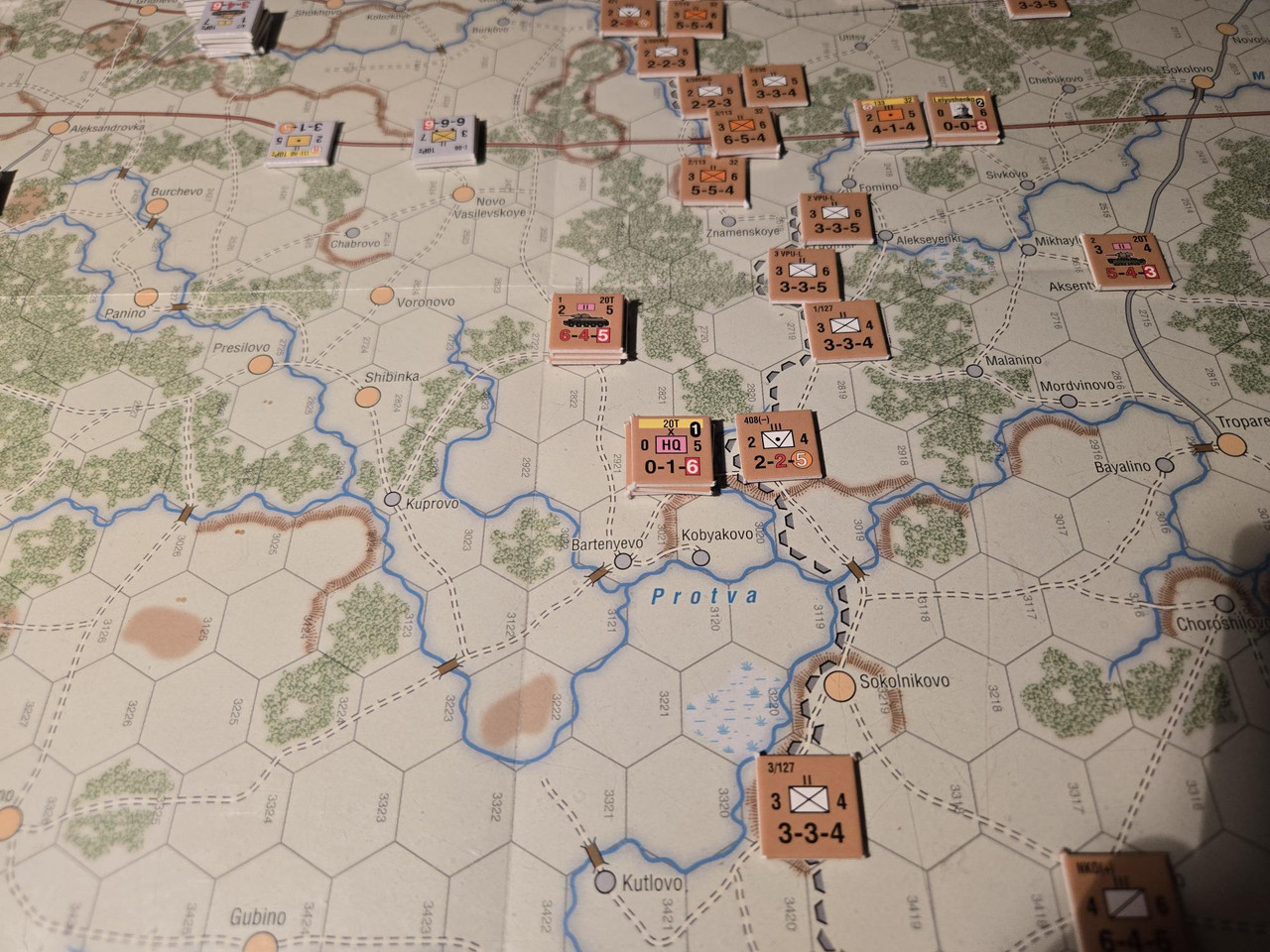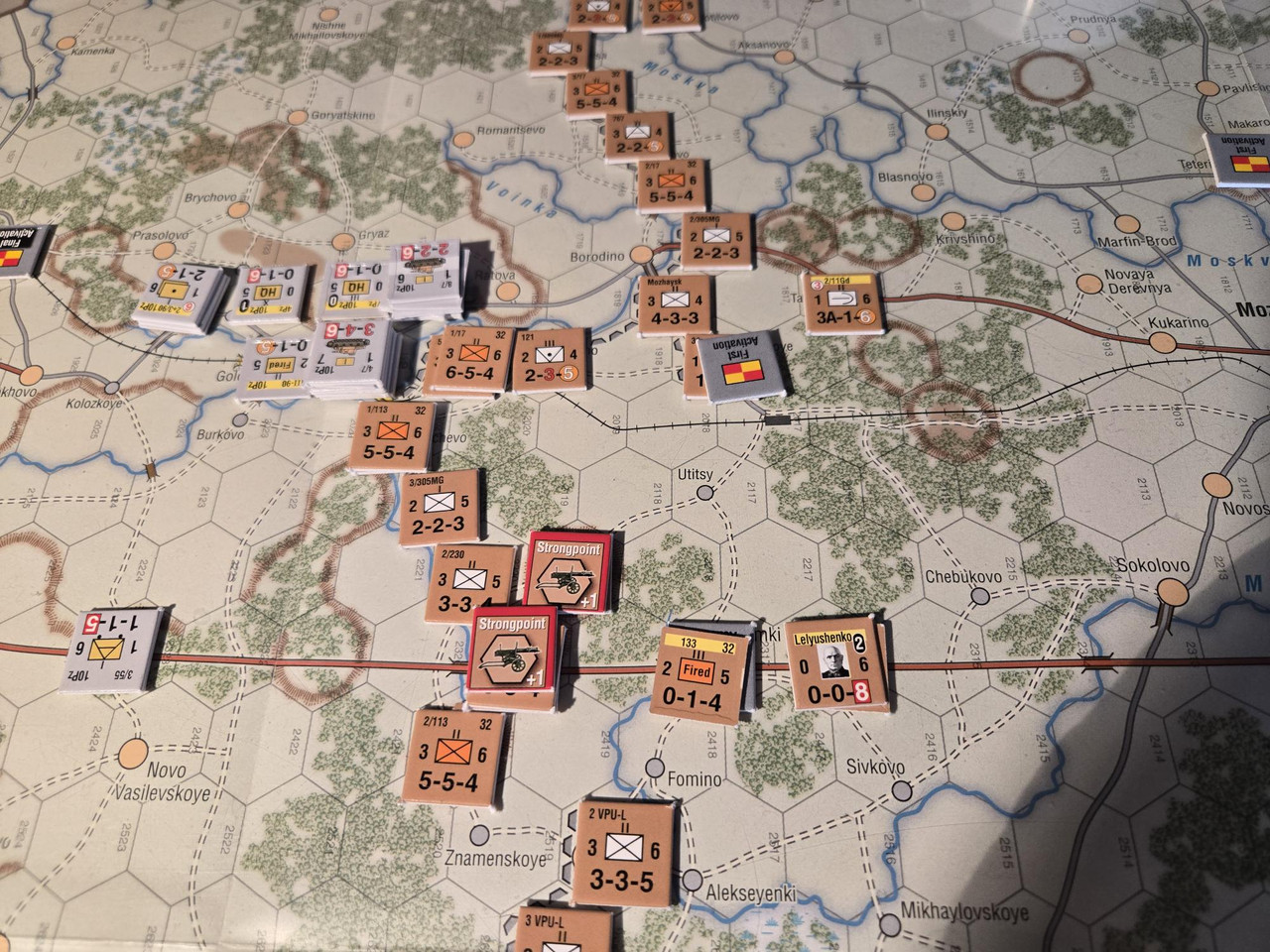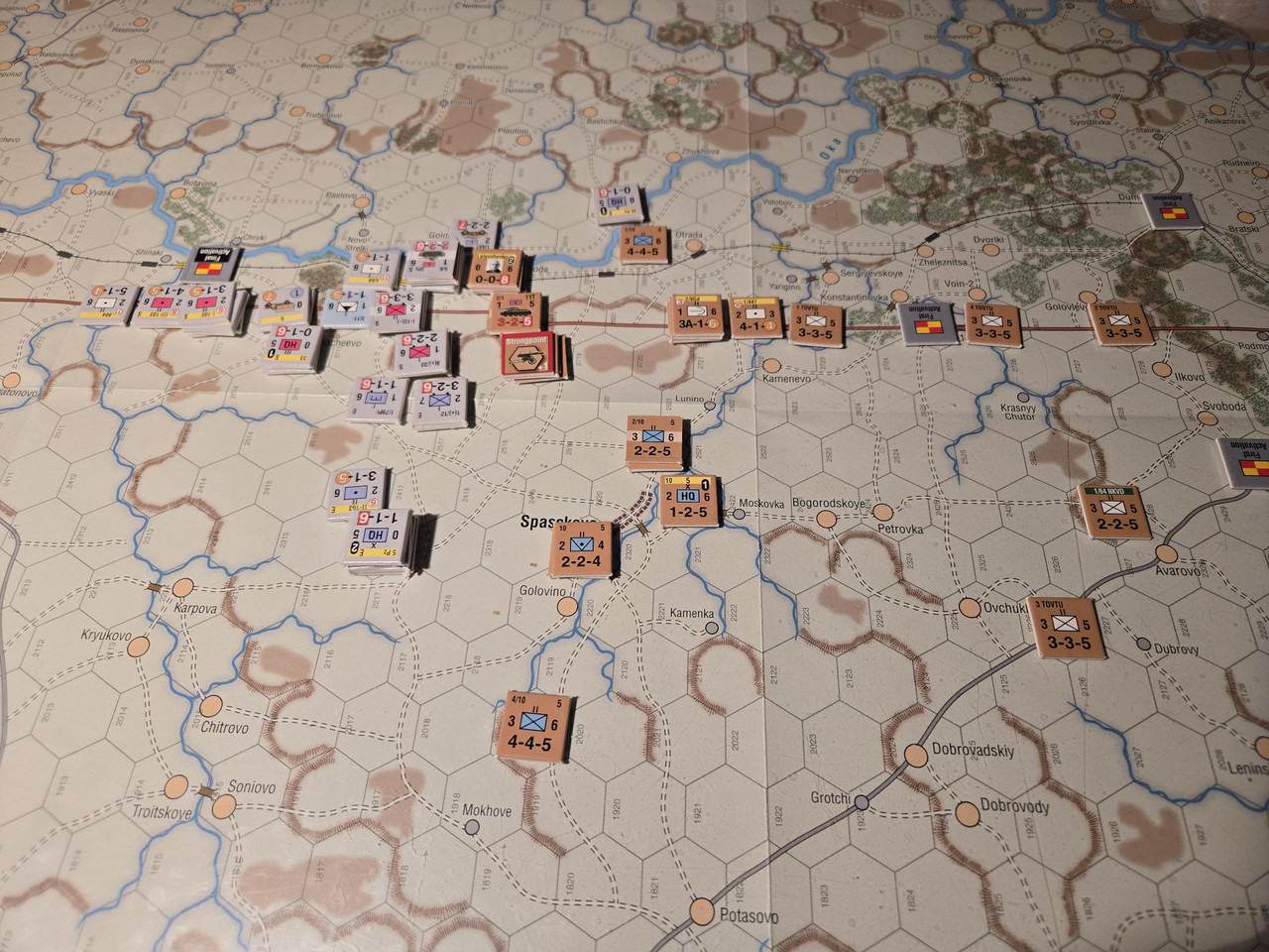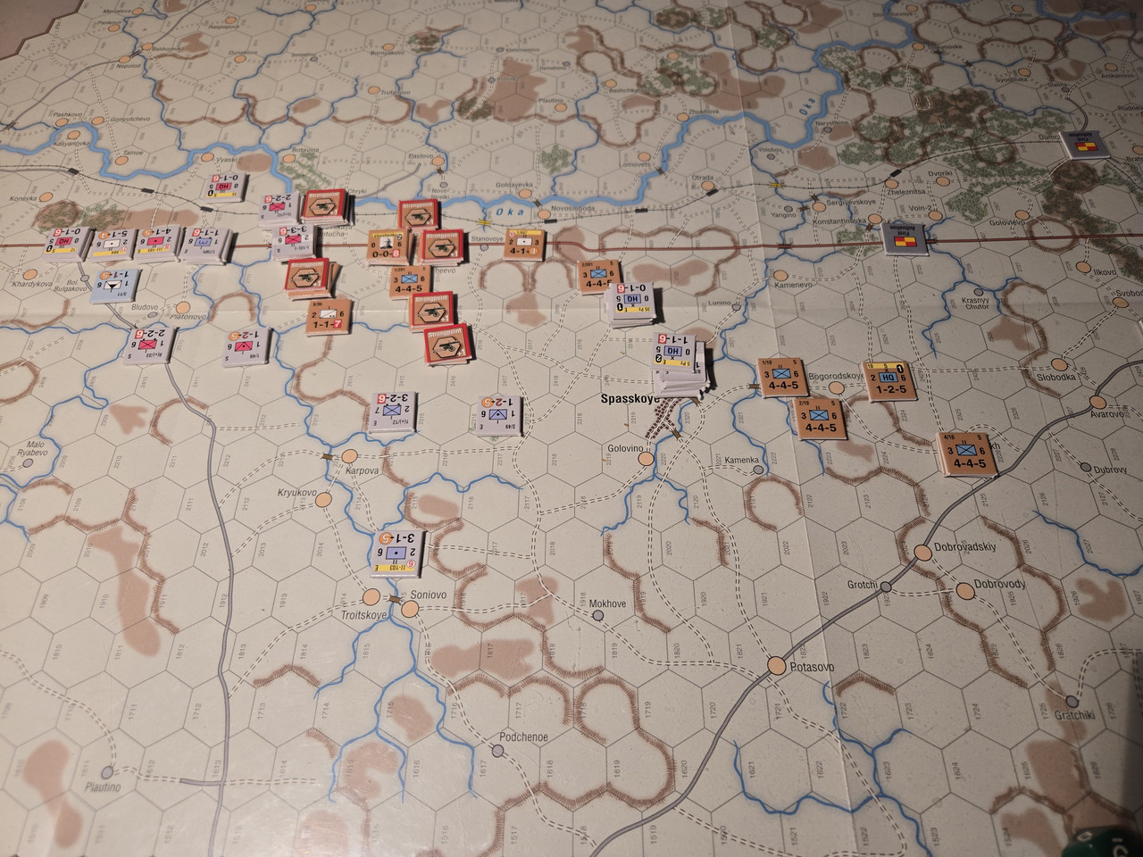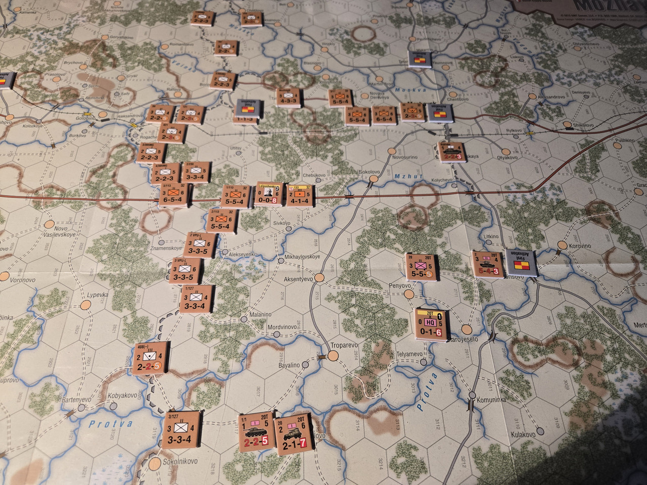 Utgångsläge för Mozhaysk scenariot. Bara ryssar på kartan. Nu är väster åt vänster, norr uppåt och öster åt höger. Den rödbruna vägen som går på övre halvan av kartan i väst-östlig riktning är motorvägen mellan Warszawa, Minsk, Smolensk, Vyazma och Moskva.