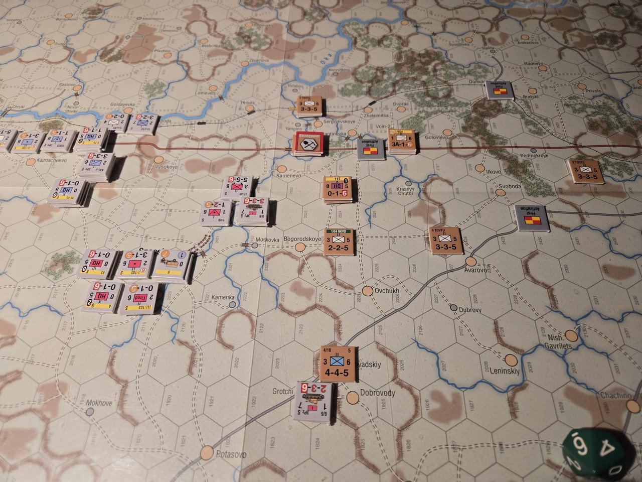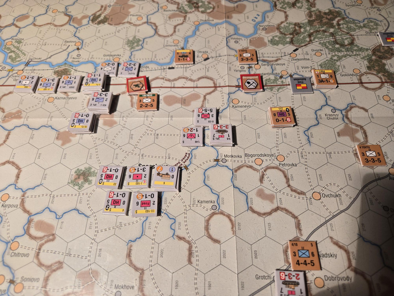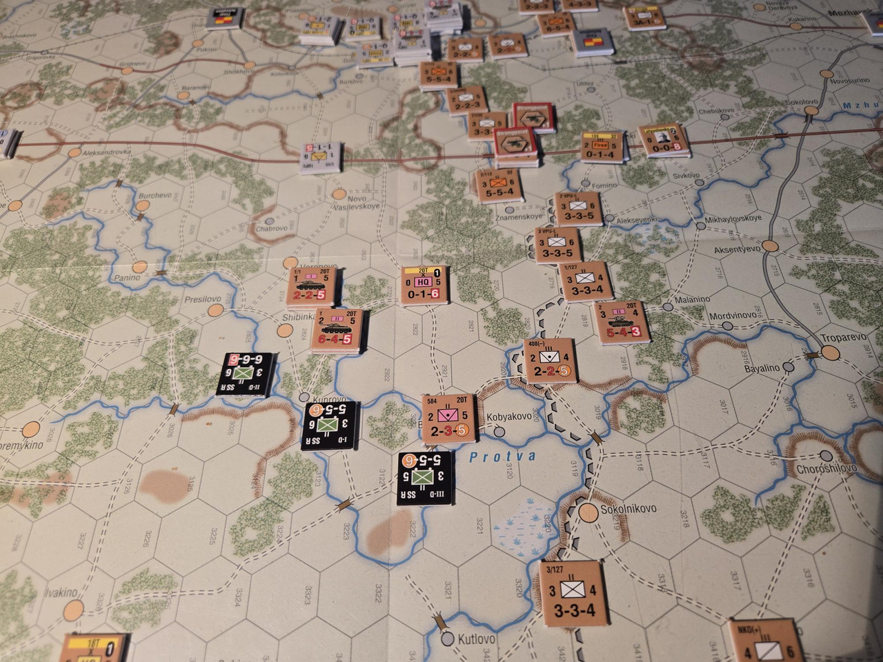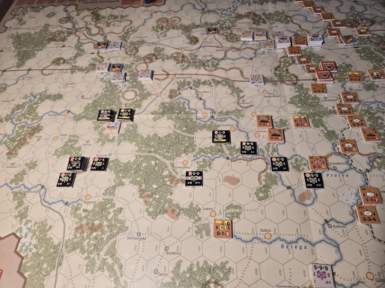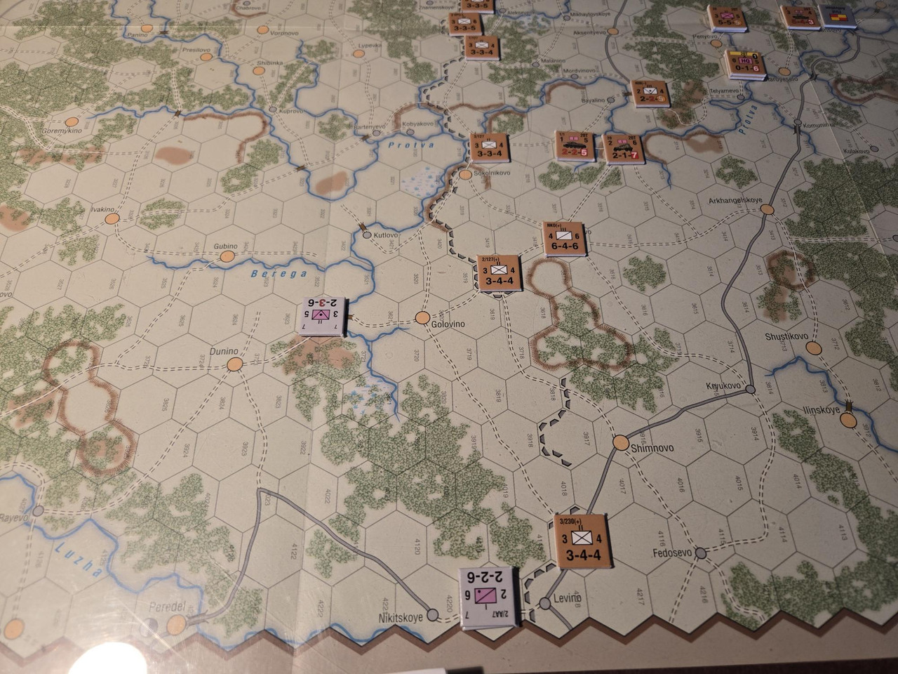 Utgångsläge för Mozhaysk scenariot. Bara ryssar på kartan. Nu är väster åt vänster, norr uppåt och öster åt höger. Den rödbruna vägen som går på övre halvan av kartan i väst-östlig riktning är motorvägen mellan Warszawa, Minsk, Smolensk, Vyazma och Moskva.