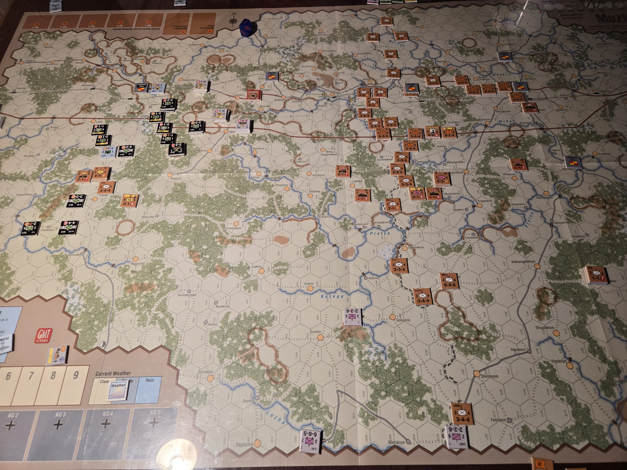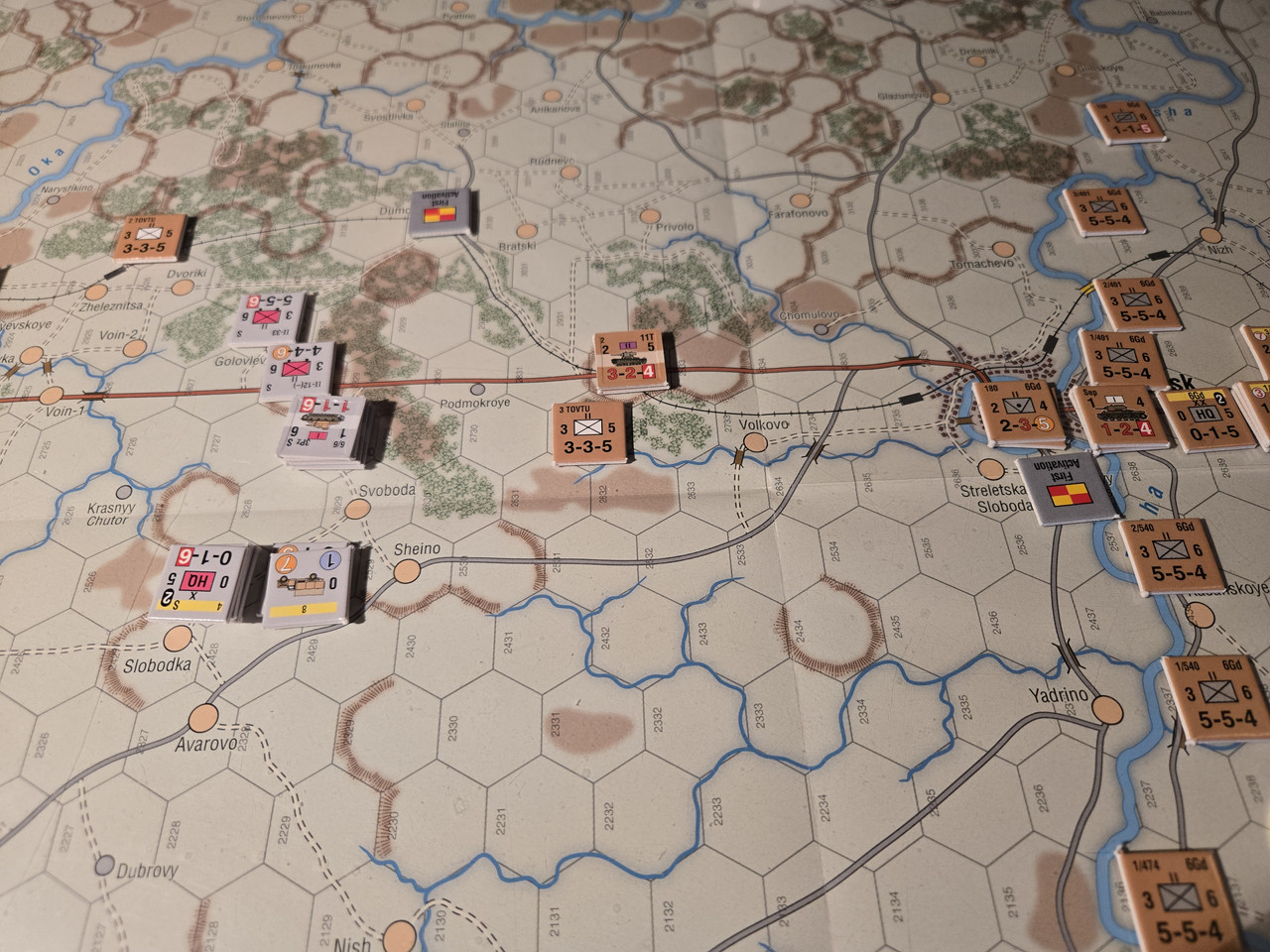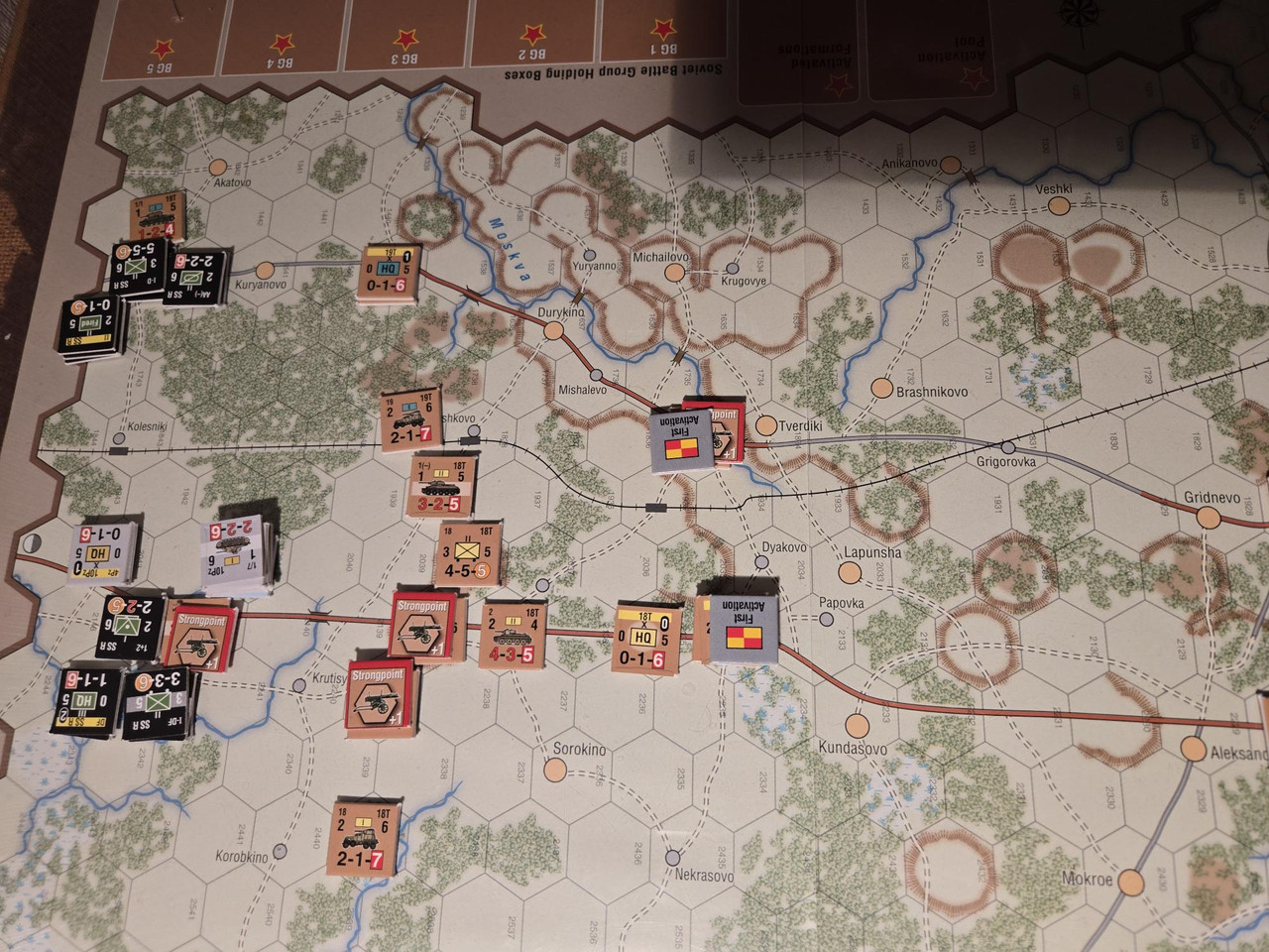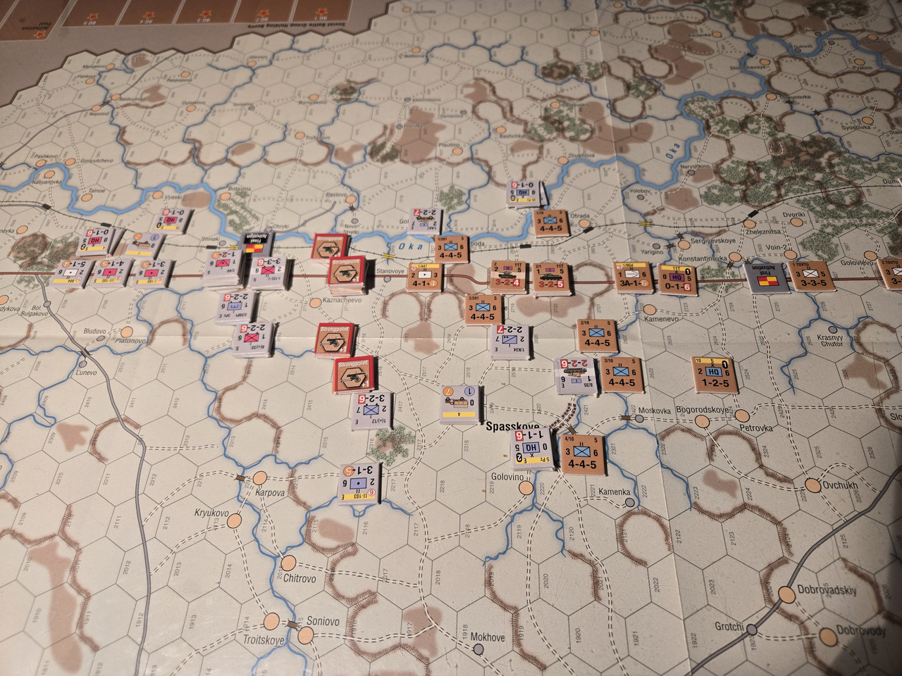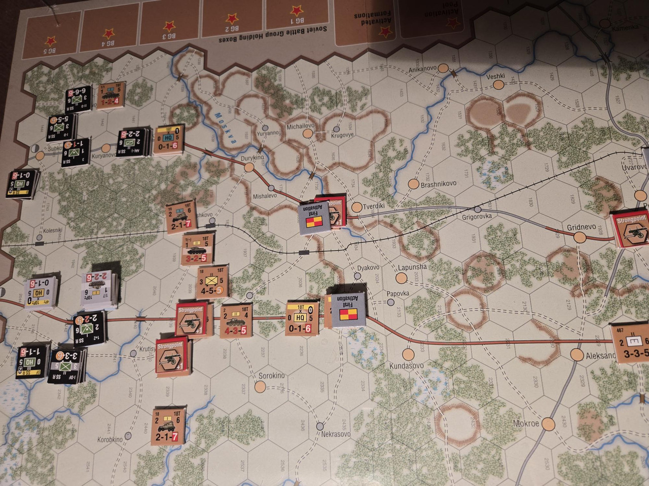 Utgångsläge för Mozhaysk scenariot. Bara ryssar på kartan. Nu är väster åt vänster, norr uppåt och öster åt höger. Den rödbruna vägen som går på övre halvan av kartan i väst-östlig riktning är motorvägen mellan Warszawa, Minsk, Smolensk, Vyazma och Moskva.