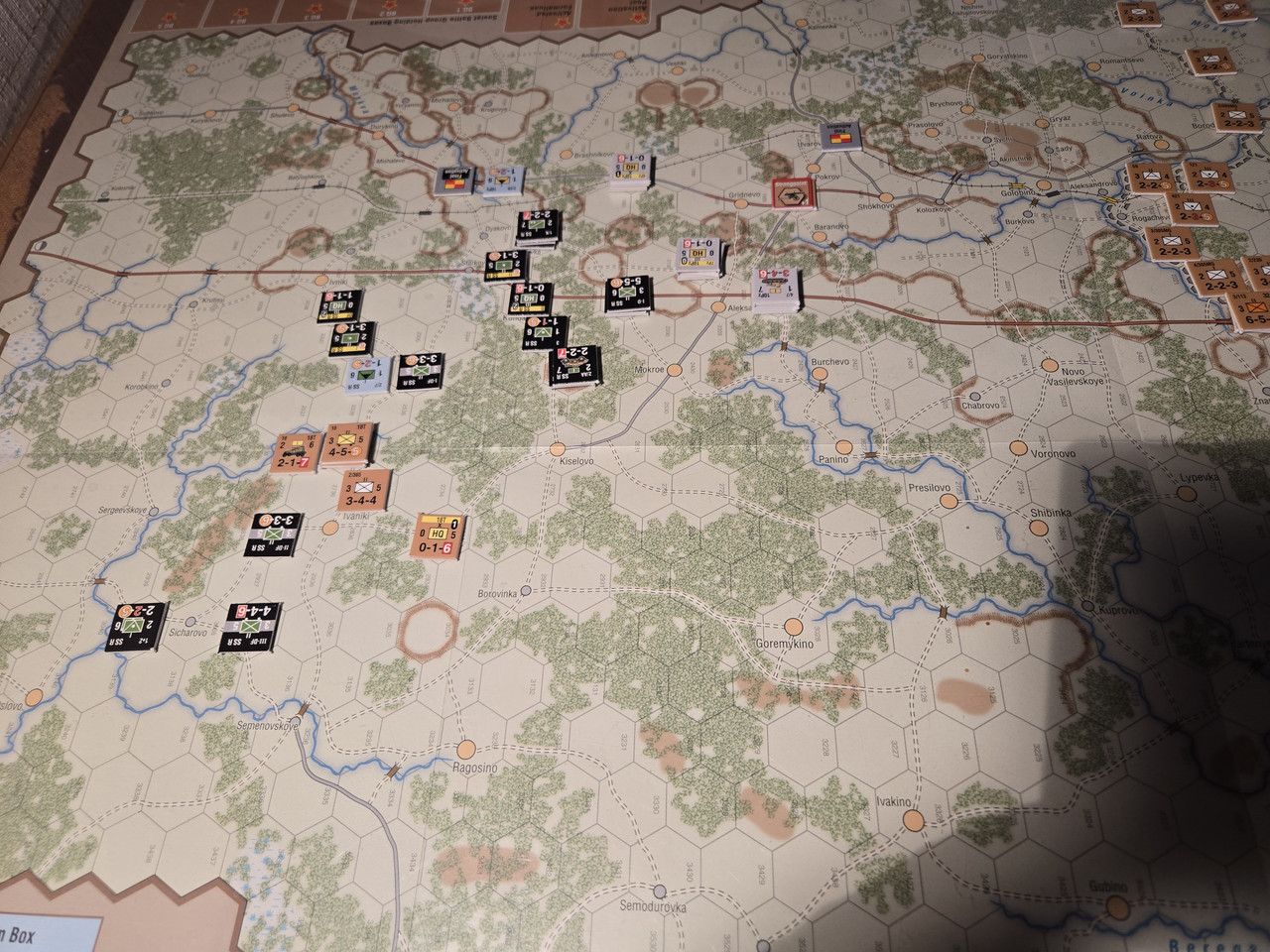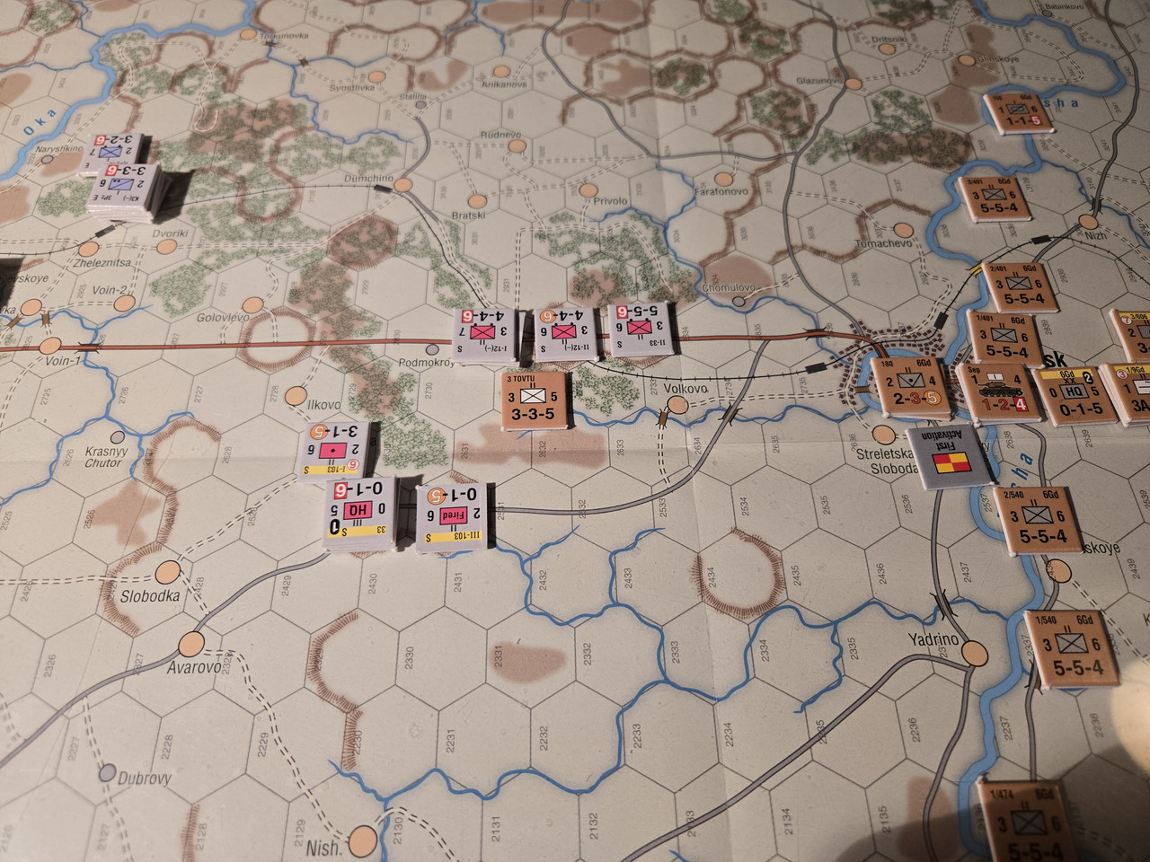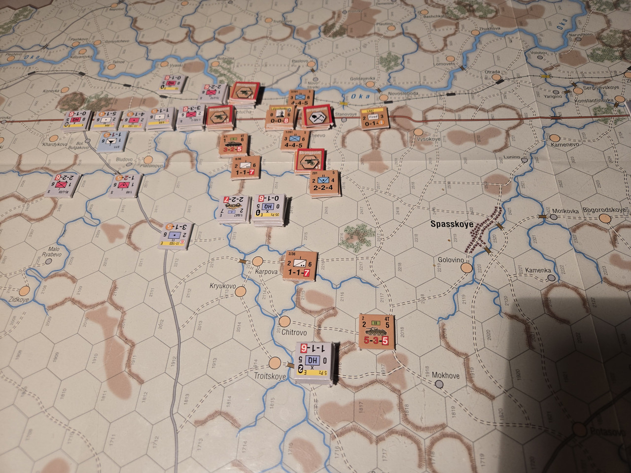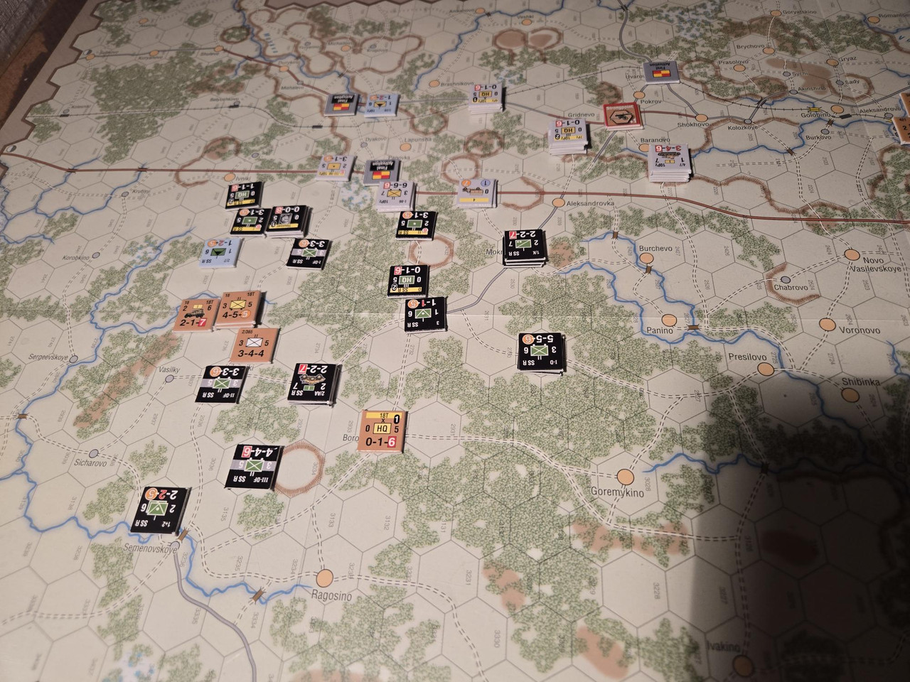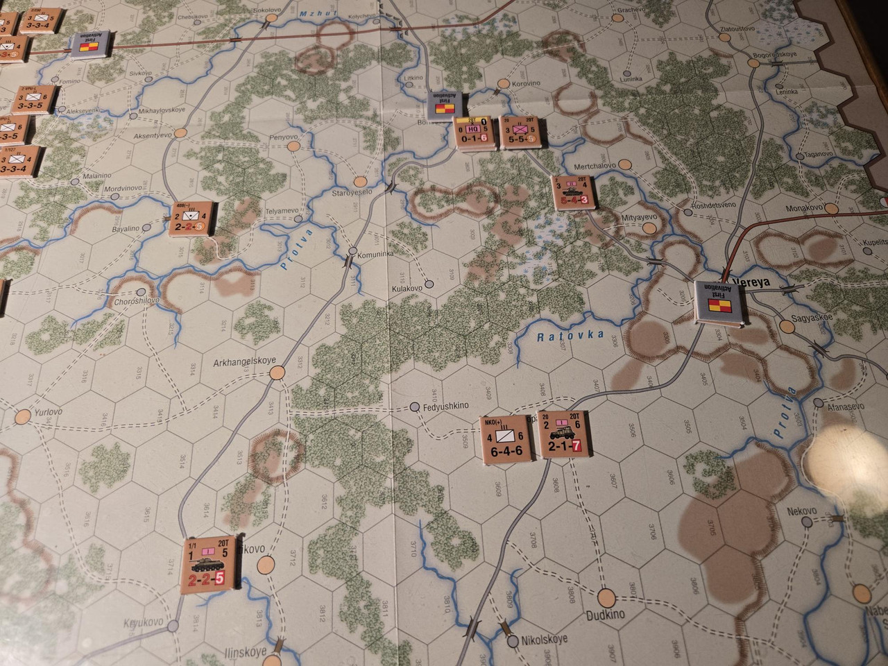 Utgångsläge för Mozhaysk scenariot. Bara ryssar på kartan. Nu är väster åt vänster, norr uppåt och öster åt höger. Den rödbruna vägen som går på övre halvan av kartan i väst-östlig riktning är motorvägen mellan Warszawa, Minsk, Smolensk, Vyazma och Moskva.
