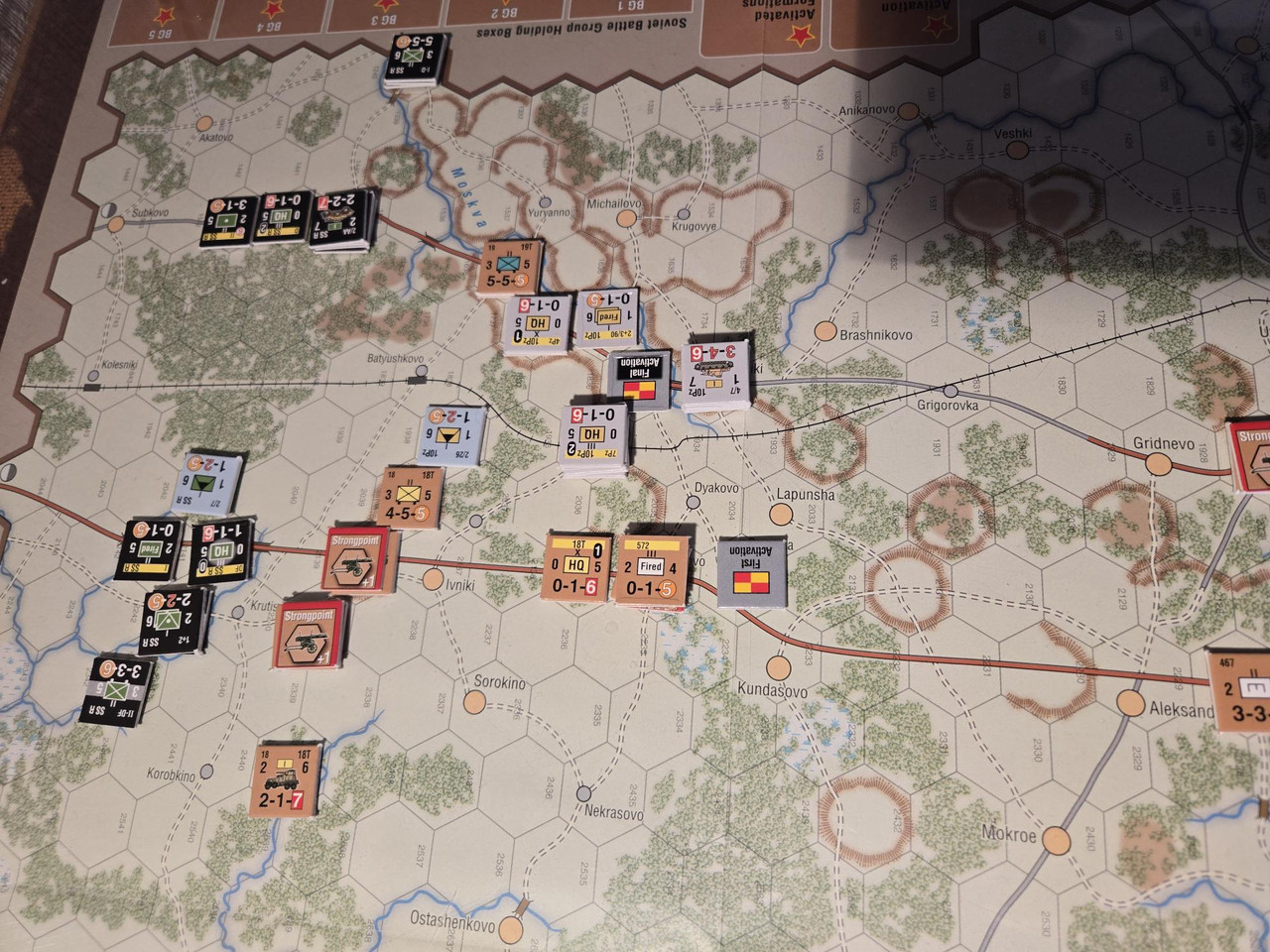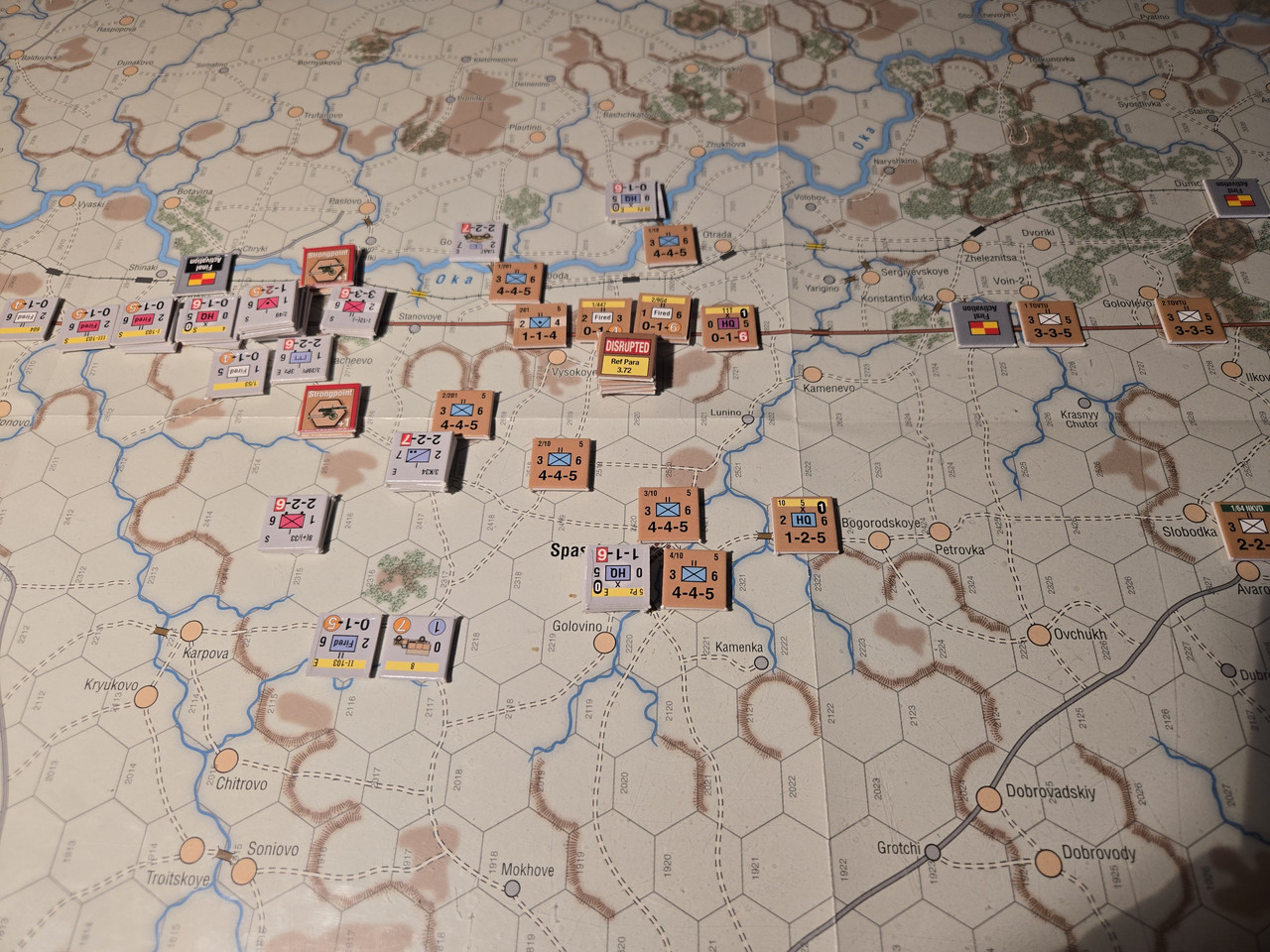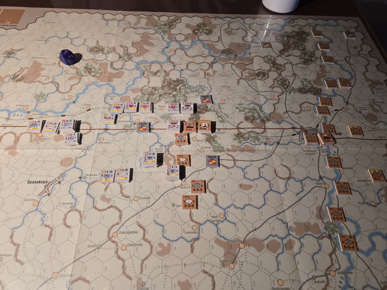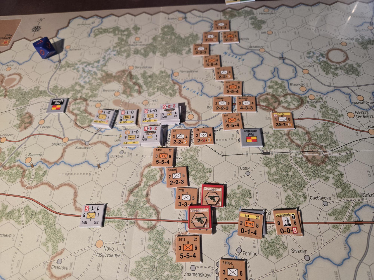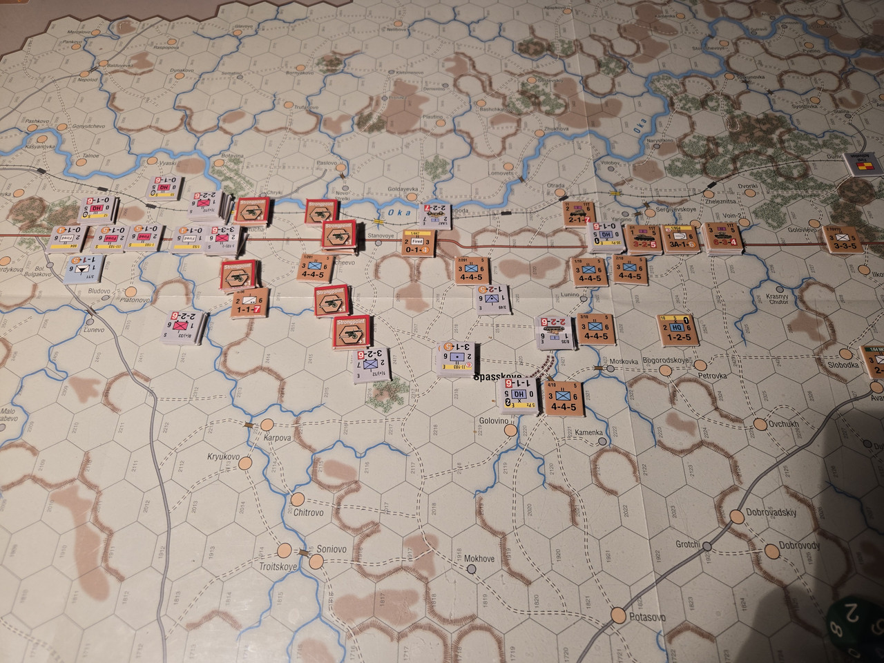 Utgångsläge för Mozhaysk scenariot. Bara ryssar på kartan. Nu är väster åt vänster, norr uppåt och öster åt höger. Den rödbruna vägen som går på övre halvan av kartan i väst-östlig riktning är motorvägen mellan Warszawa, Minsk, Smolensk, Vyazma och Moskva.