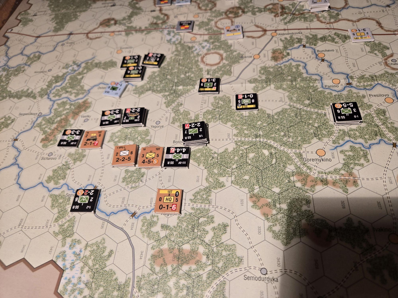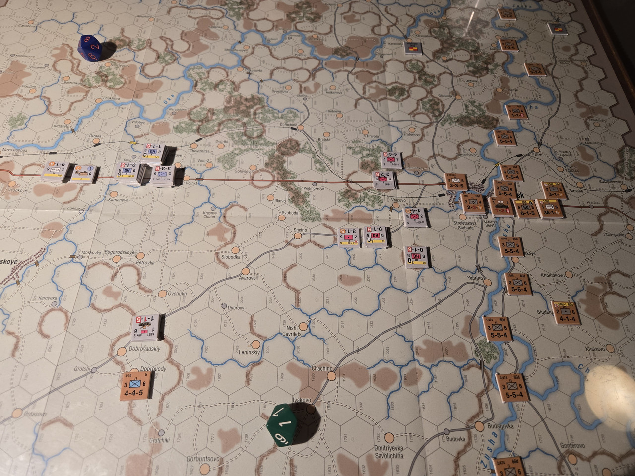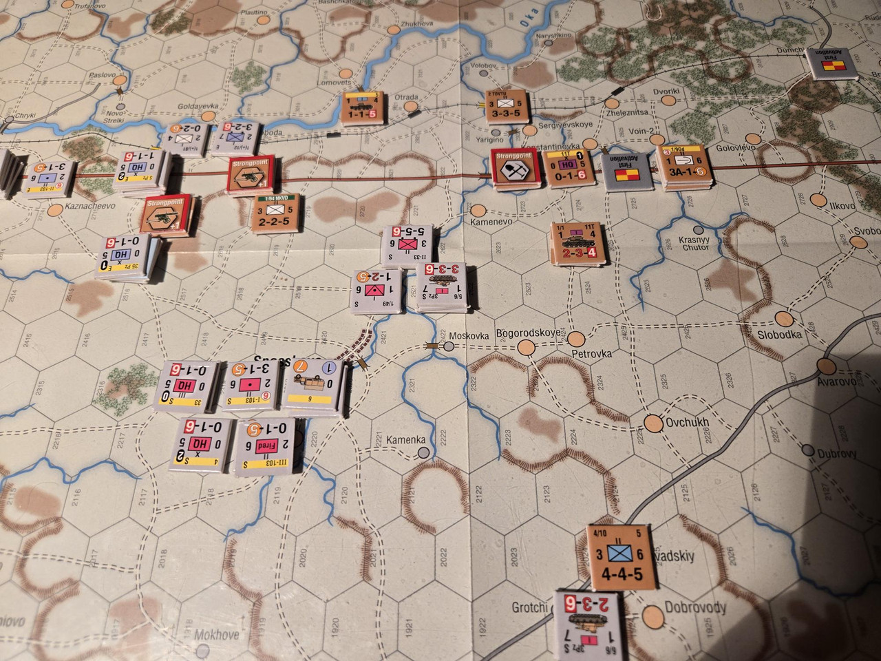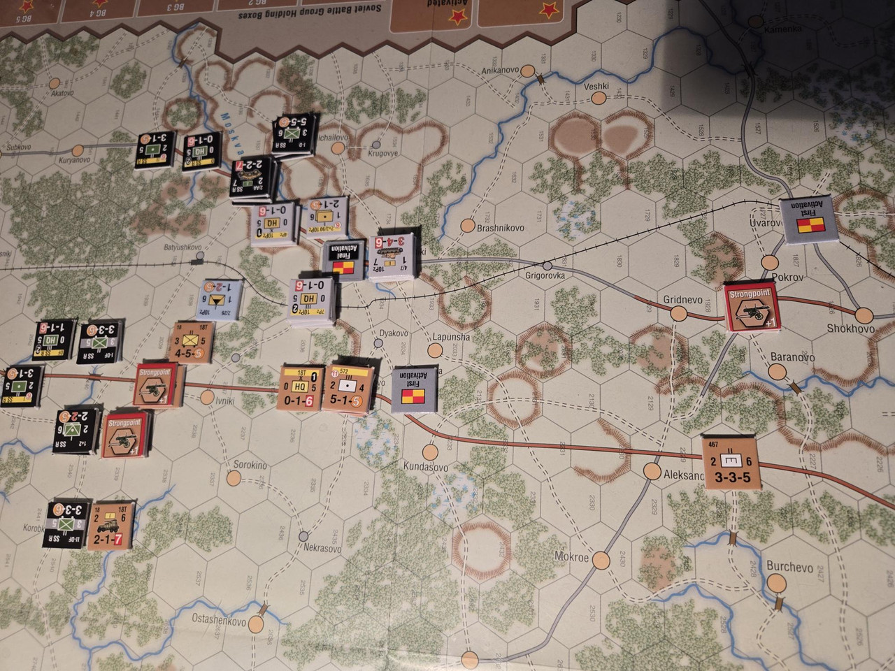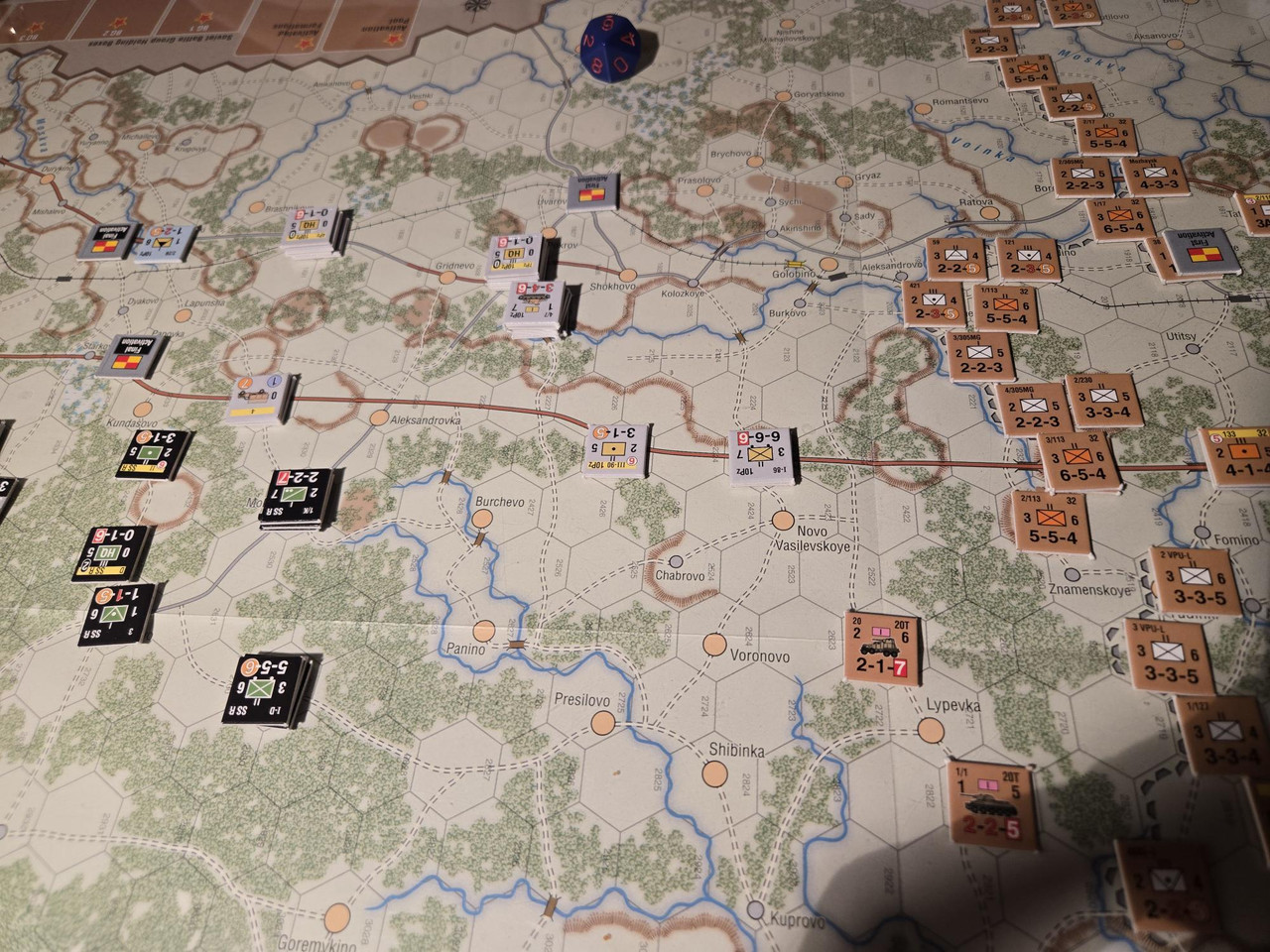 Utgångsläge för Mozhaysk scenariot. Bara ryssar på kartan. Nu är väster åt vänster, norr uppåt och öster åt höger. Den rödbruna vägen som går på övre halvan av kartan i väst-östlig riktning är motorvägen mellan Warszawa, Minsk, Smolensk, Vyazma och Moskva.