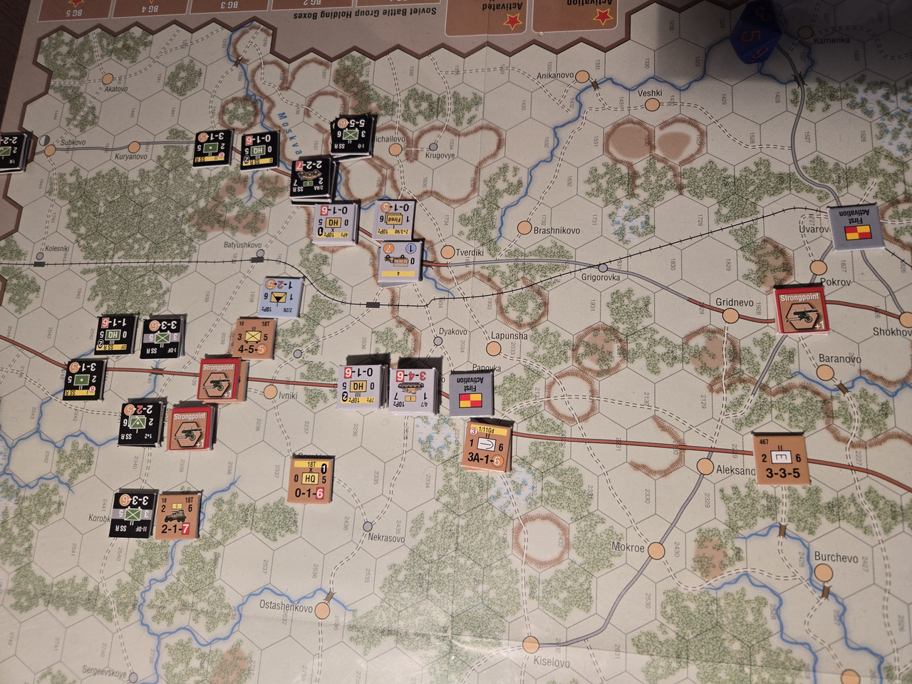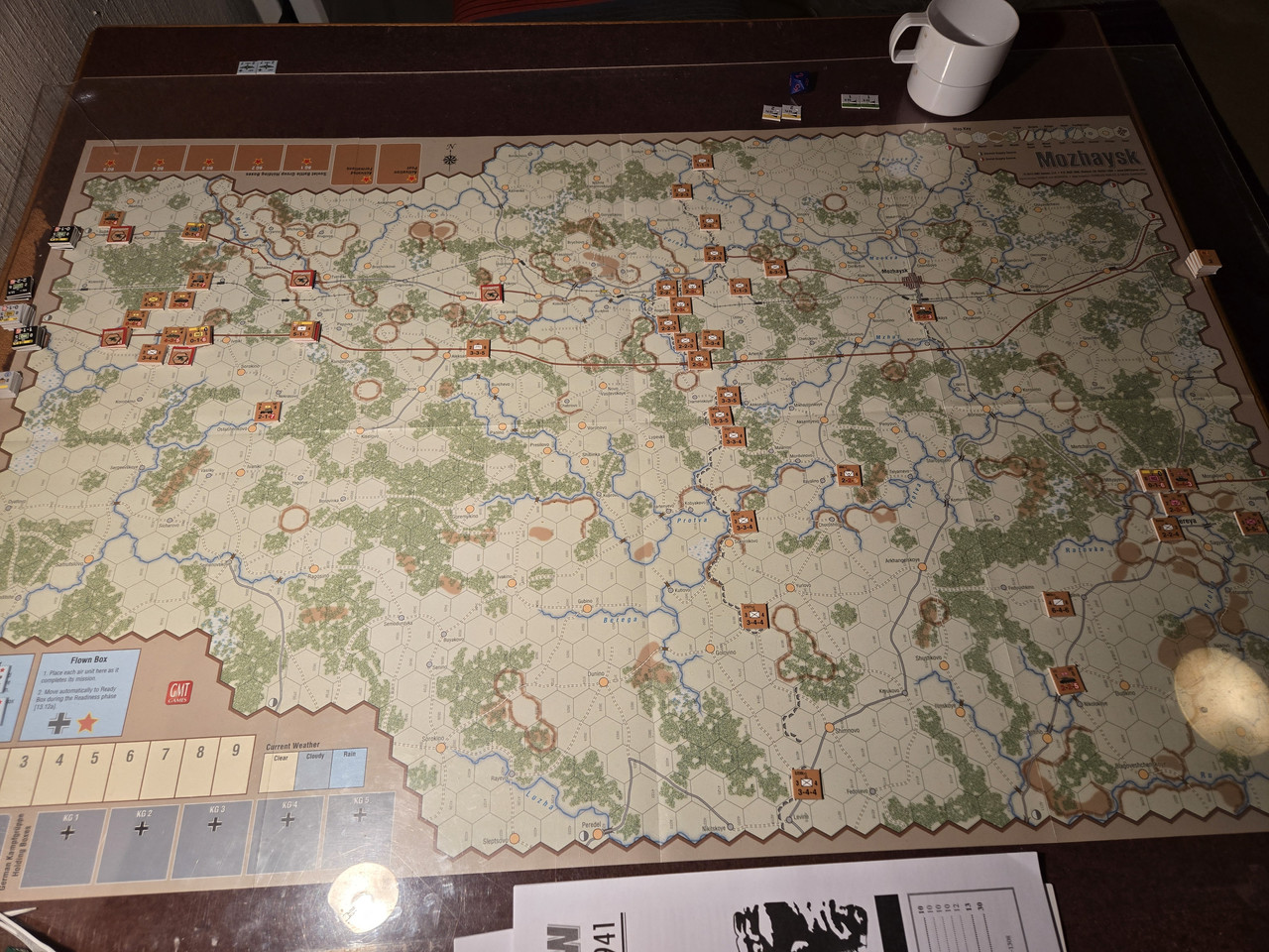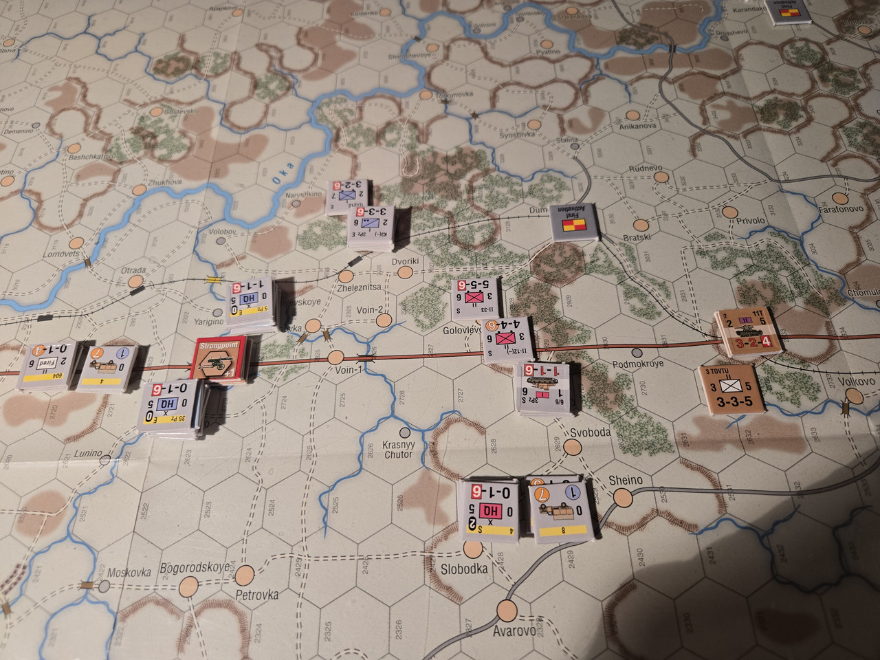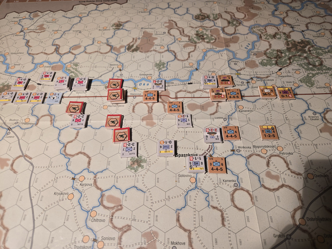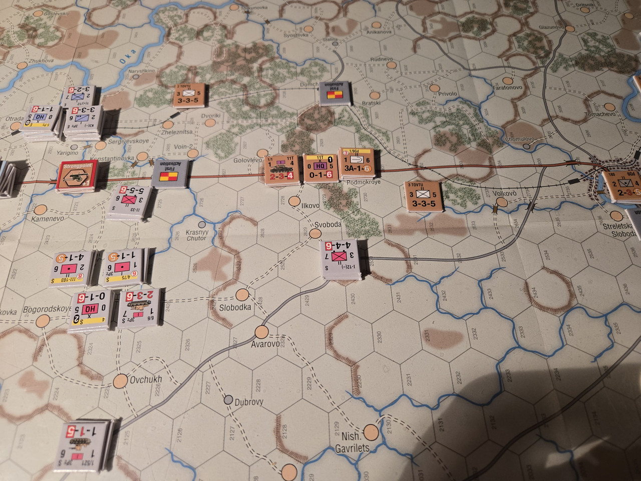 Utgångsläge för Mozhaysk scenariot. Bara ryssar på kartan. Nu är väster åt vänster, norr uppåt och öster åt höger. Den rödbruna vägen som går på övre halvan av kartan i väst-östlig riktning är motorvägen mellan Warszawa, Minsk, Smolensk, Vyazma och Moskva.
