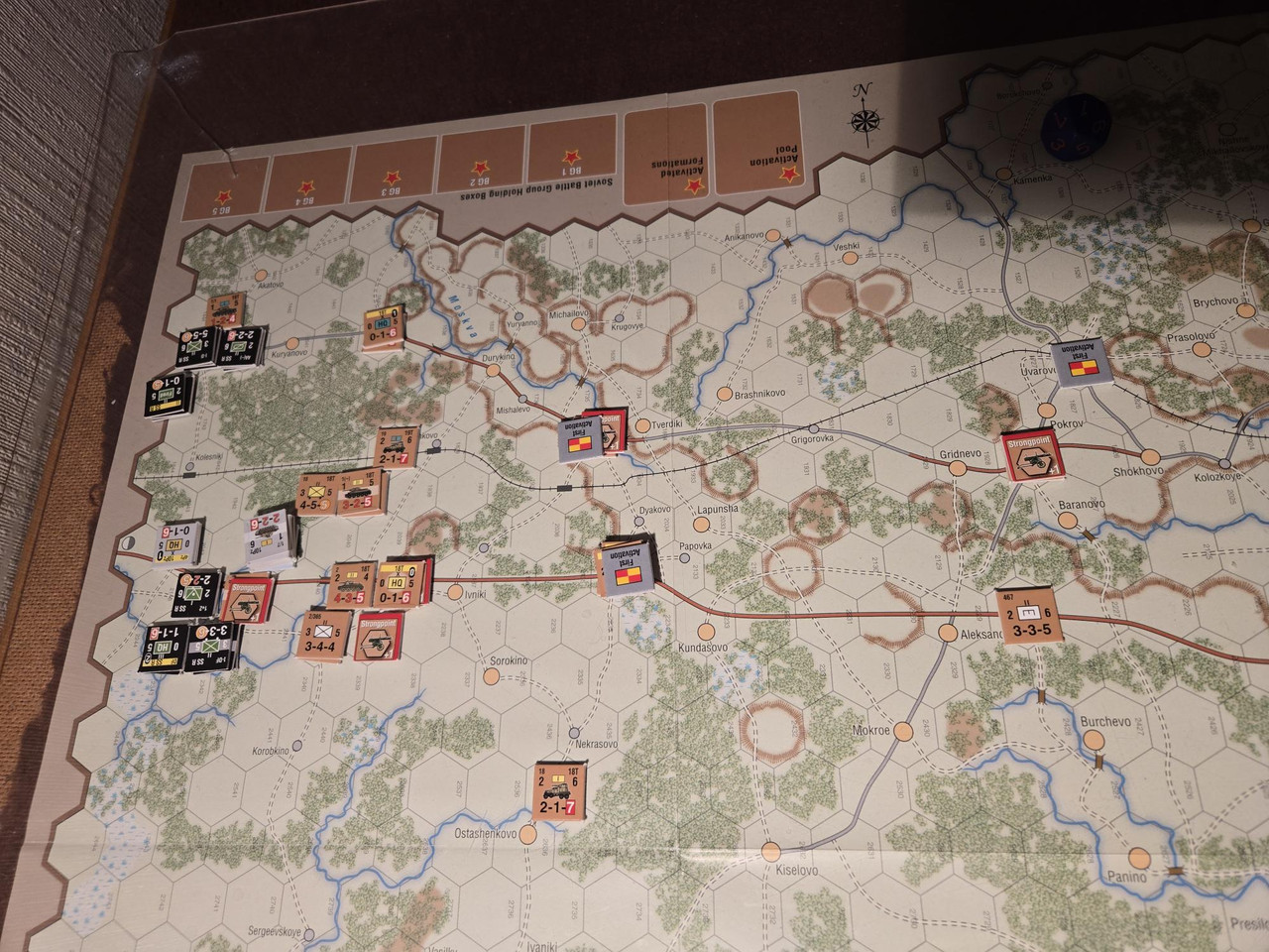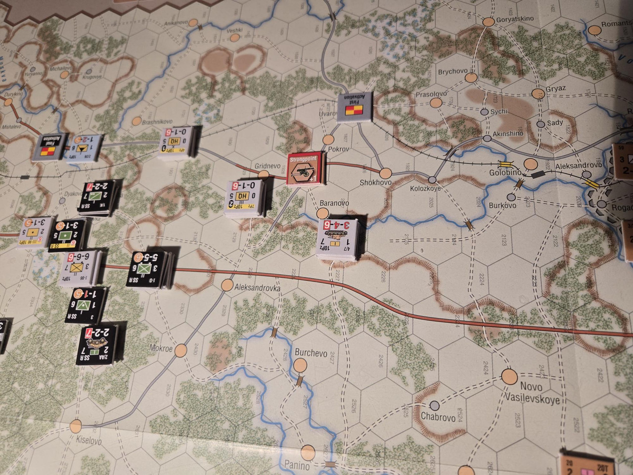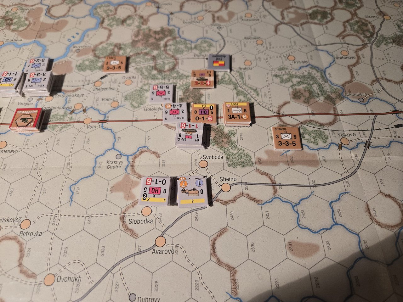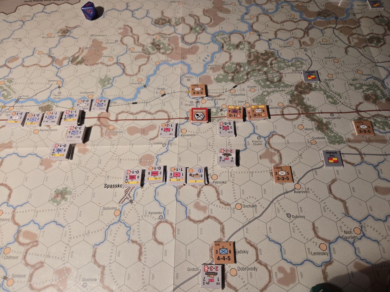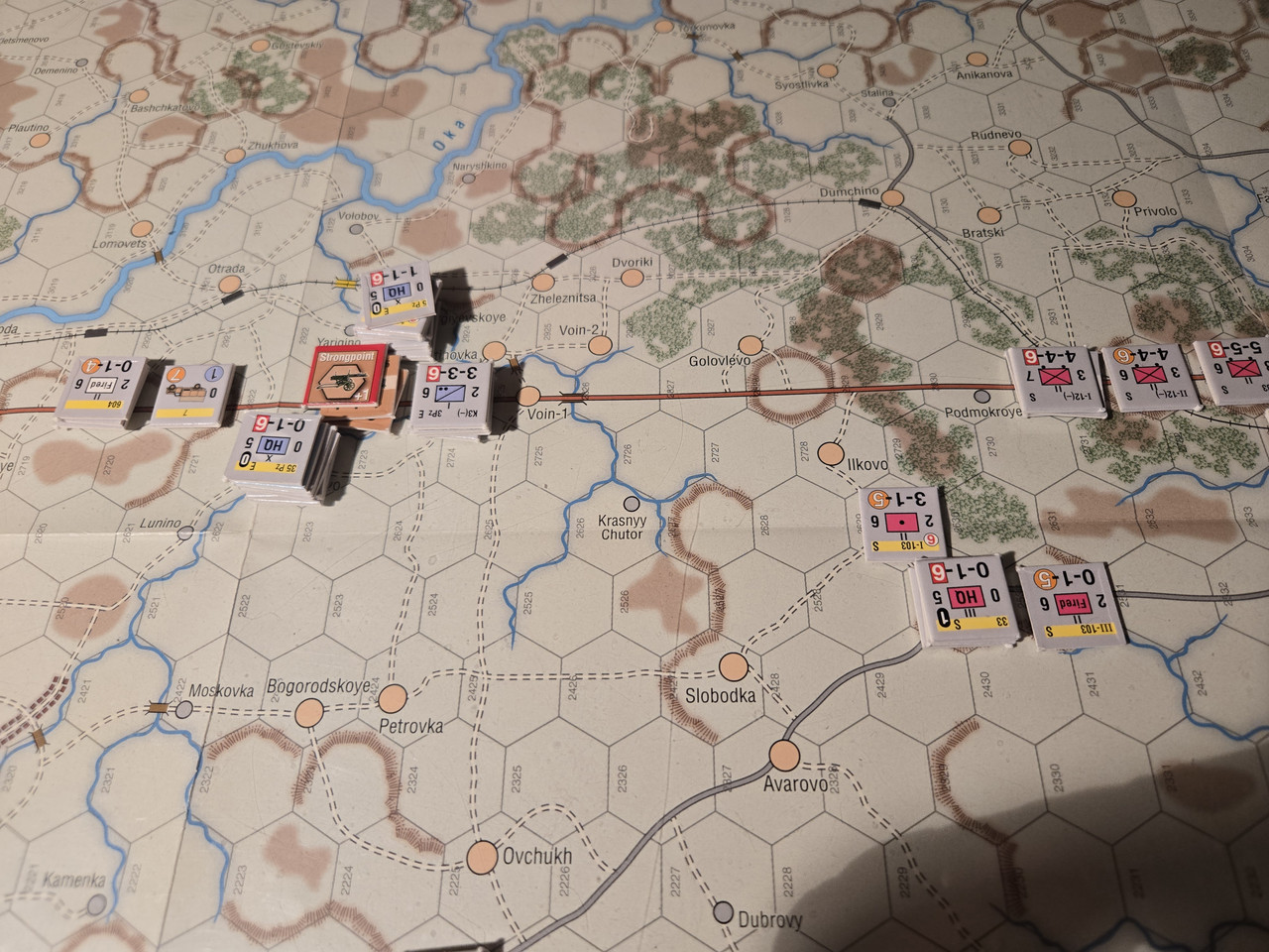 Utgångsläge för Mozhaysk scenariot. Bara ryssar på kartan. Nu är väster åt vänster, norr uppåt och öster åt höger. Den rödbruna vägen som går på övre halvan av kartan i väst-östlig riktning är motorvägen mellan Warszawa, Minsk, Smolensk, Vyazma och Moskva.