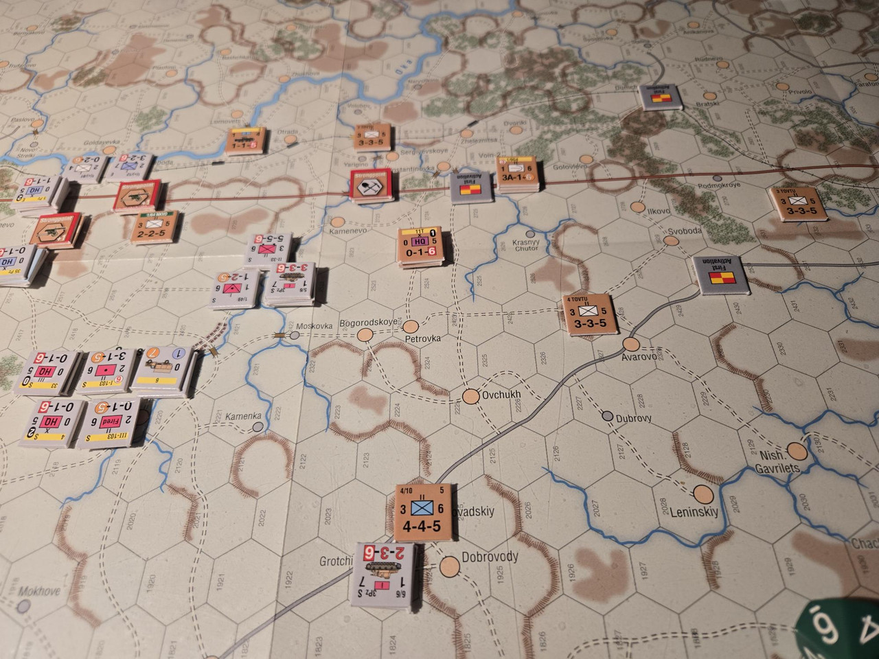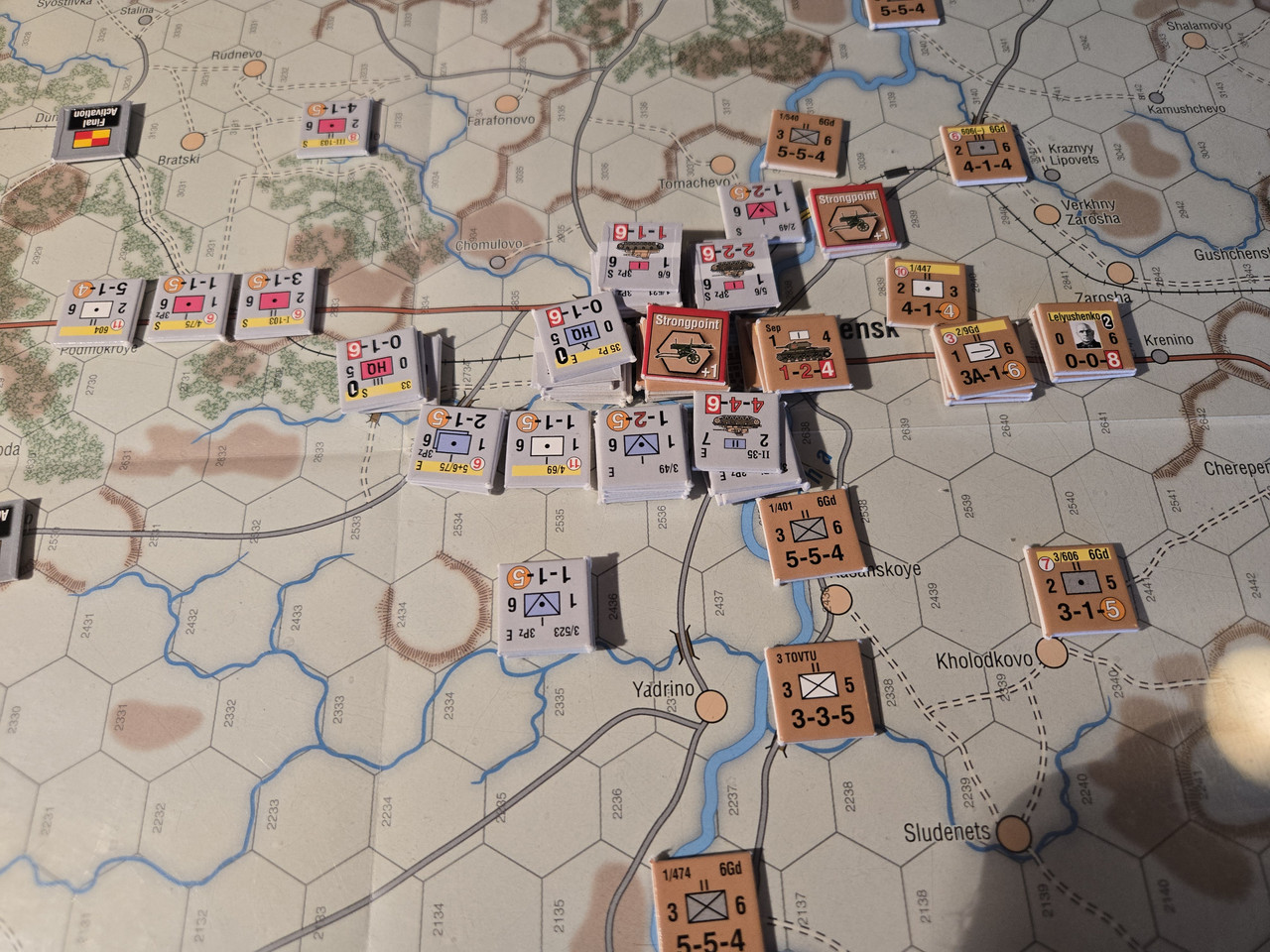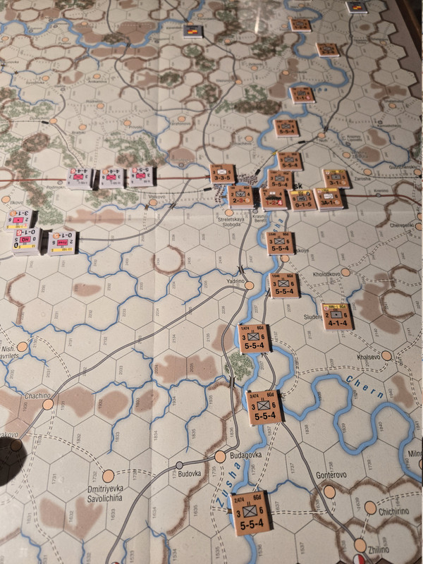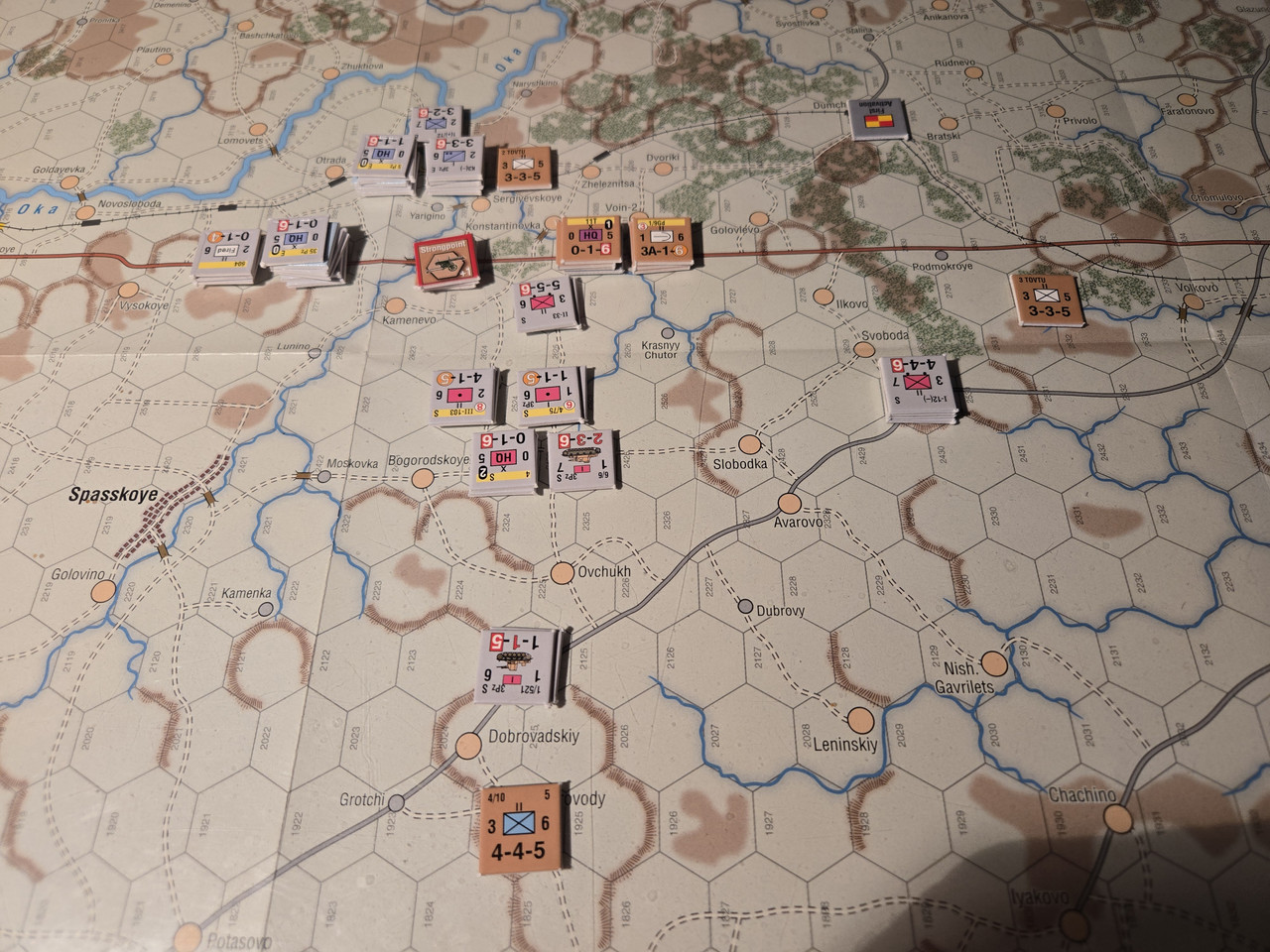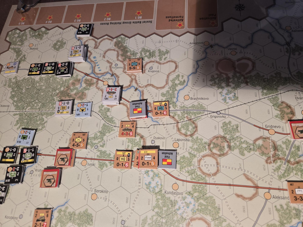 10 pansars två stridsvagnsbataljoner plus den motoriserade skyttebataljonen kraftsamlar mot hörnet i den ryska befästa linjen. En rysk skyttebataljon nedkämpas, men det kostar tyskarna ett step loss också. Och ställningen håller. Nu blir det intressant med aktiveringar. Kommer 10 pansar hotta fullfölja innan ryssarna förstärker ställningen?