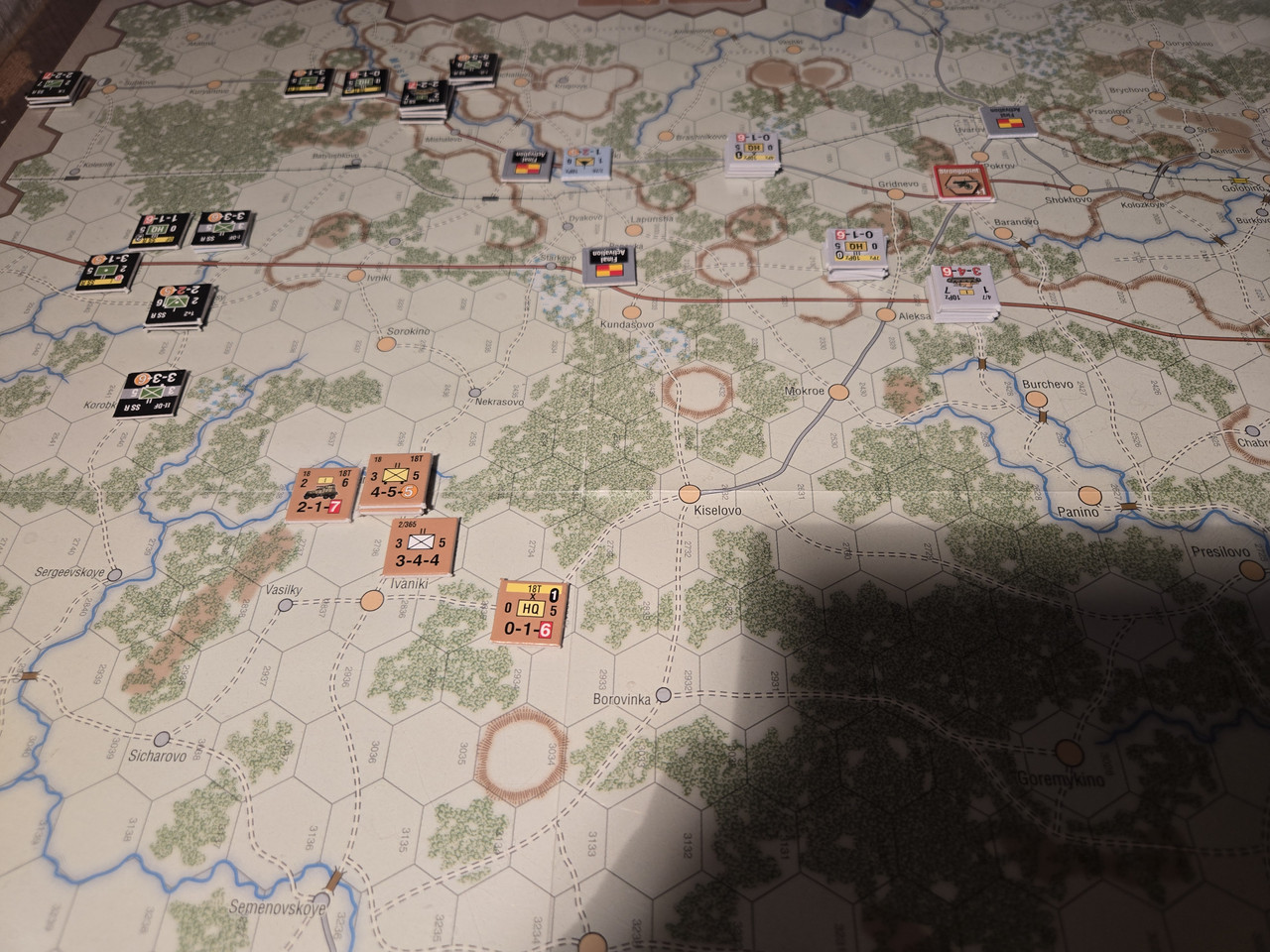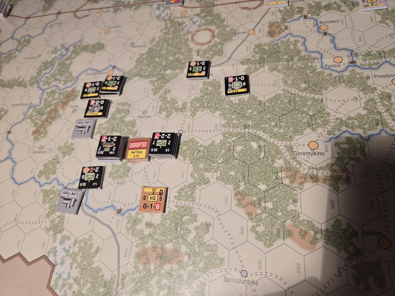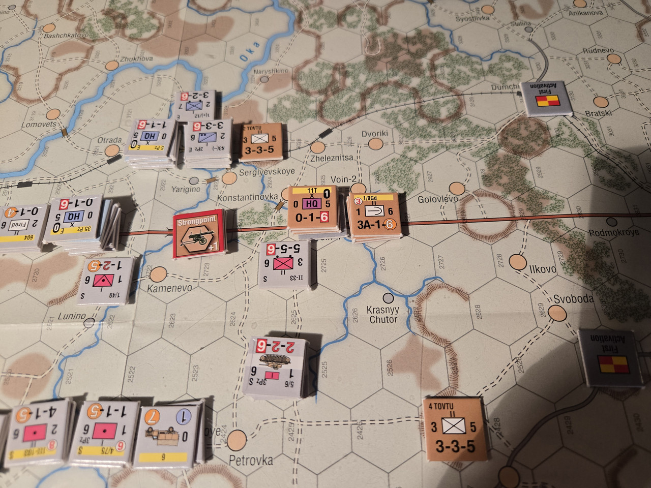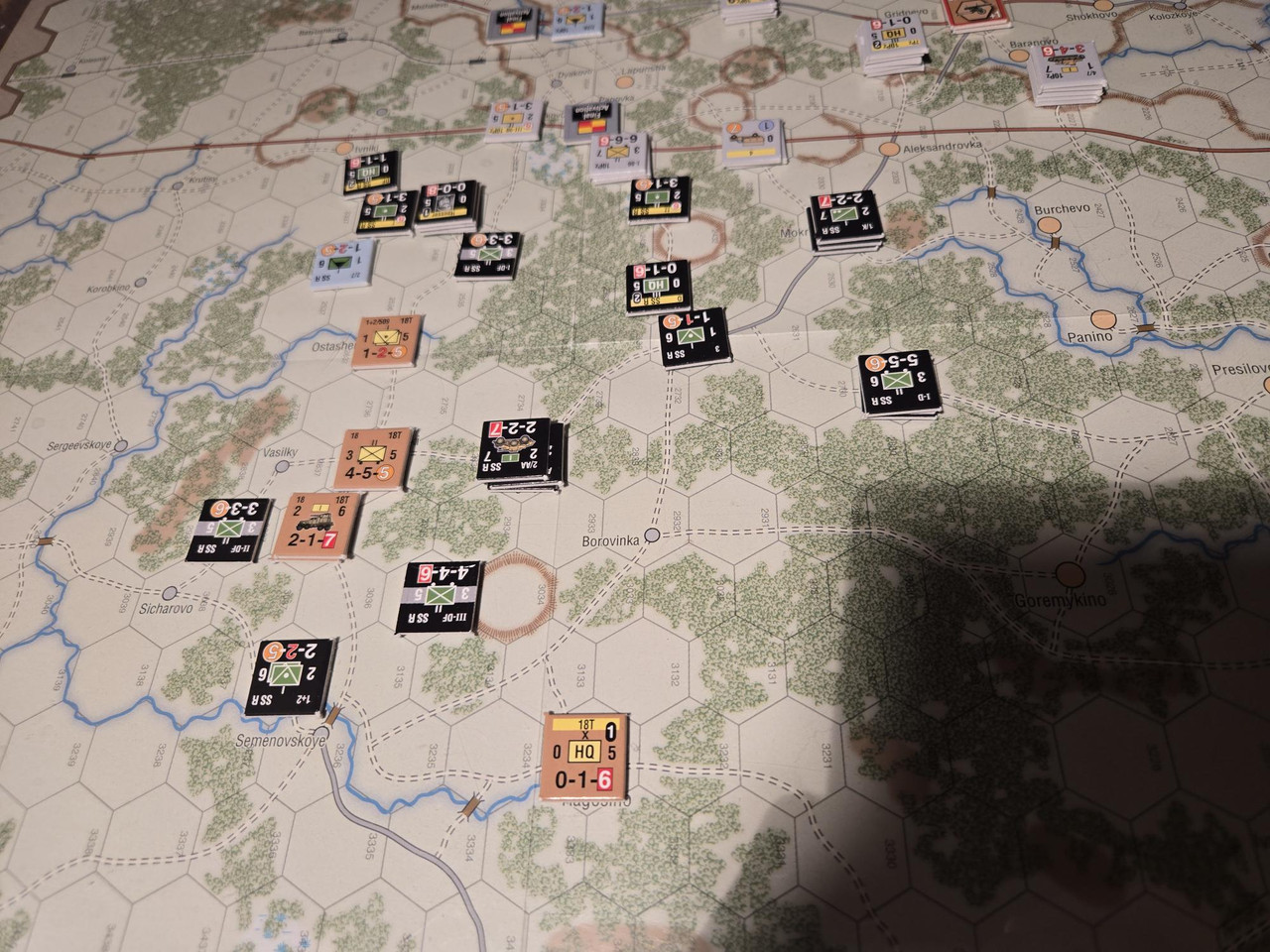 10 pansars två stridsvagnsbataljoner plus den motoriserade skyttebataljonen kraftsamlar mot hörnet i den ryska befästa linjen. En rysk skyttebataljon nedkämpas, men det kostar tyskarna ett step loss också. Och ställningen håller. Nu blir det intressant med aktiveringar. Kommer 10 pansar hotta fullfölja innan ryssarna förstärker ställningen?