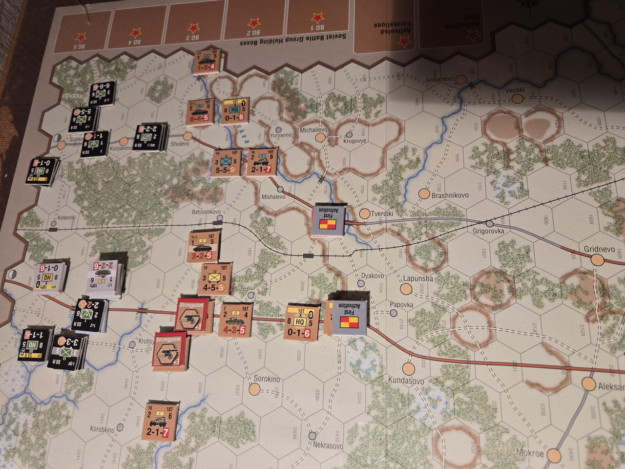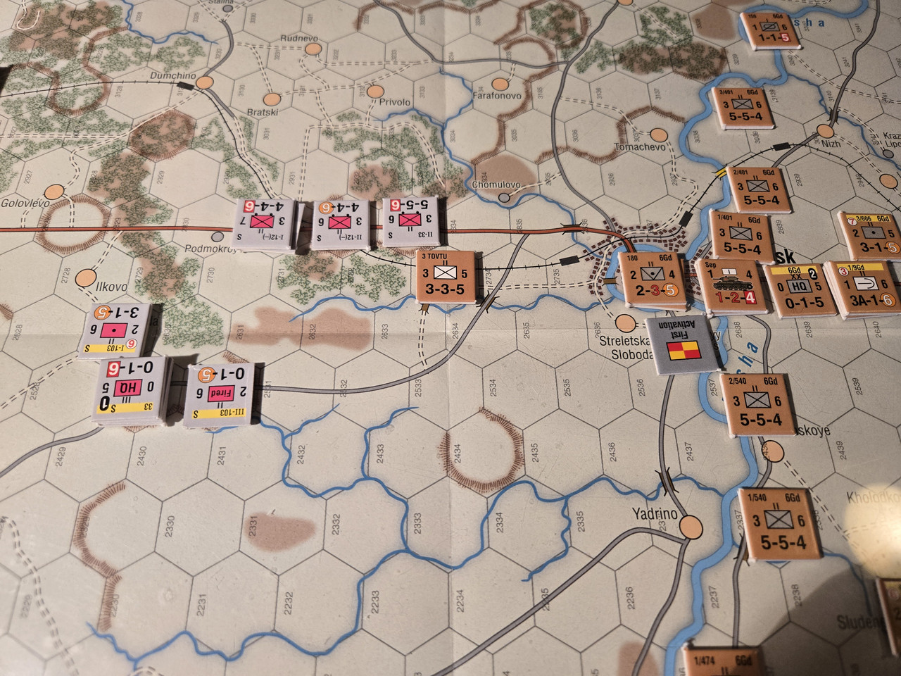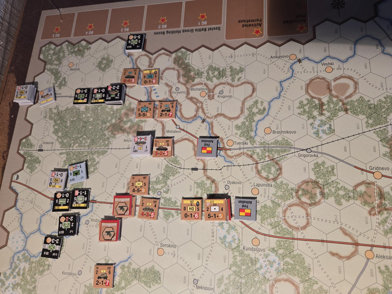 Bara ryssar på kartan vid spelstart. Längst i nordväst två pansarbrigader, 18 och 19, och en del lokalförsvar. Längre österut en försvarslinje med i huvudsak vad vi skulle kalla lokalförsvar. I sydöstra hörnet 20 pansarbrigaden.