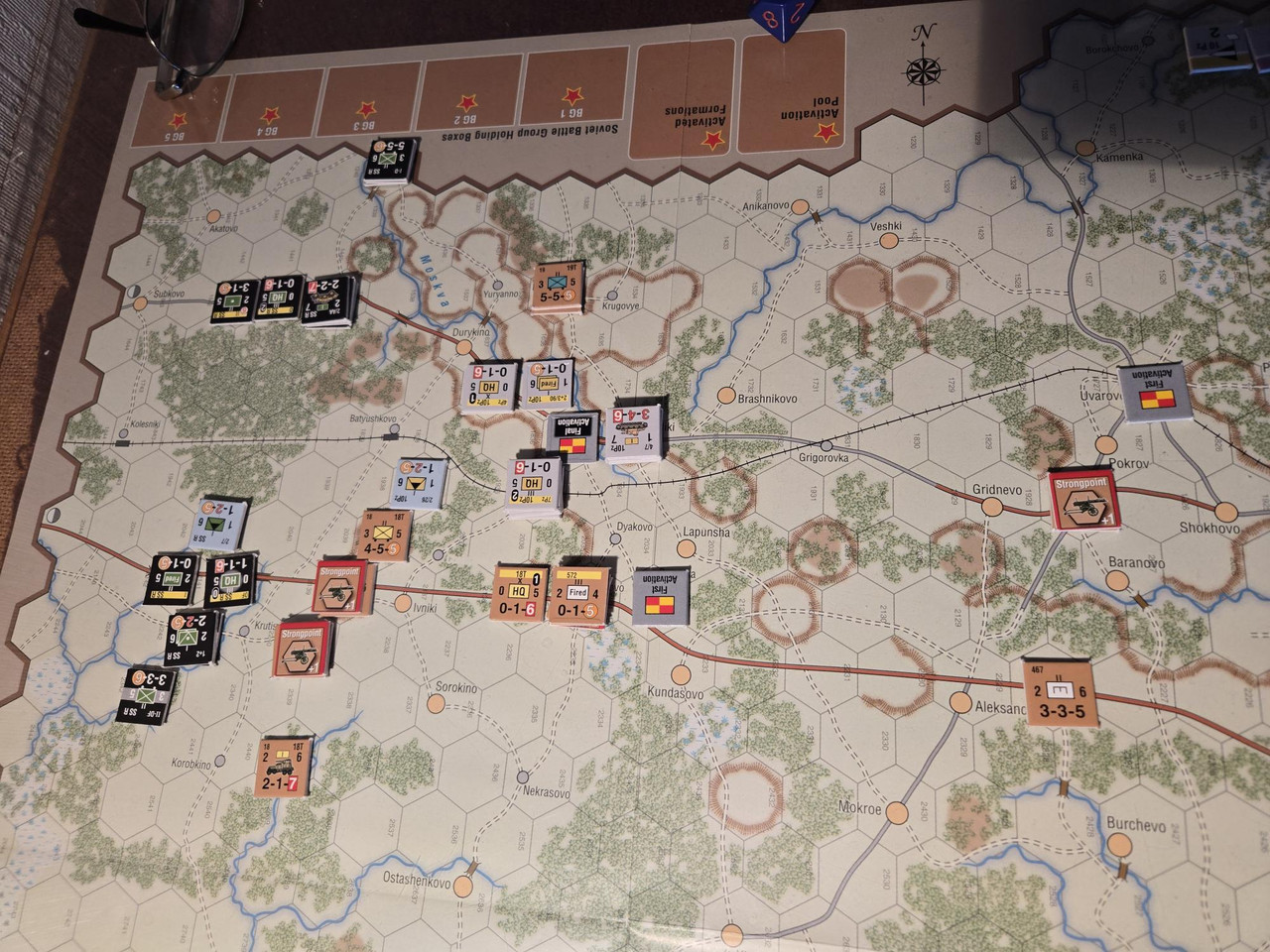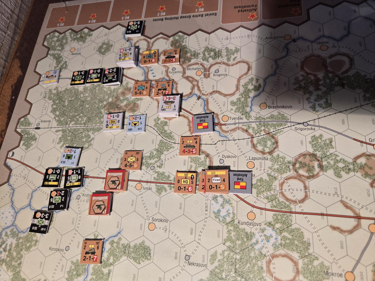 Denna gång kommer jag inte fota (nästan) varenda aktivering, utan ta ett sammanfattande foto efter varje GT. Tror att chit pull mekaniken och dess dynamik där varje tysk KG har två chits och ryssarna ett per förband, plus ett som kan användas för vilket förband som helst, framgått.