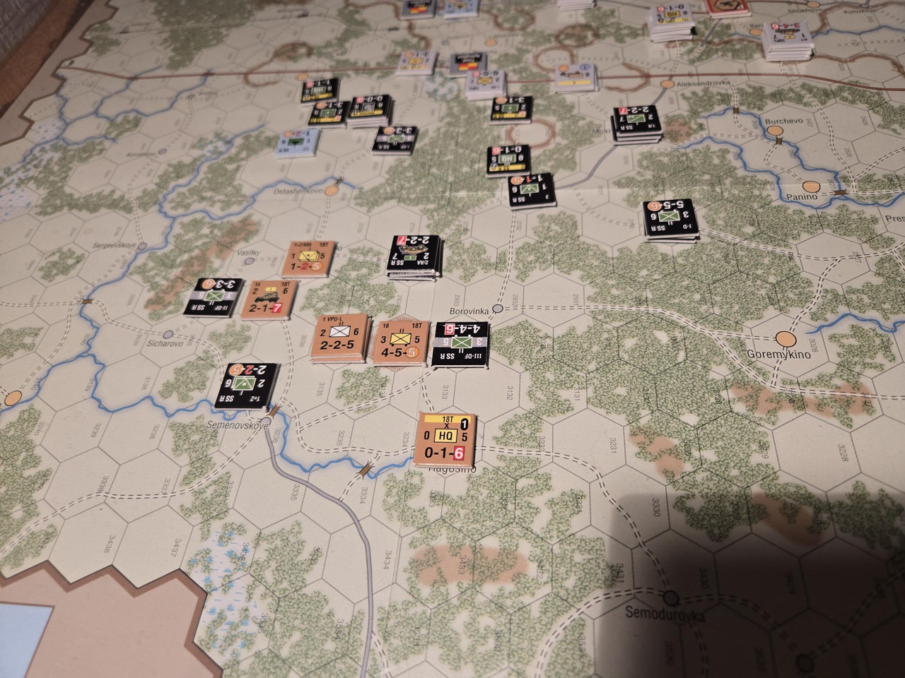 2 SS R ansätter ett anfall från norr mot 18 pansar och slår eftertruppen. Huvuddelen av R närmar sig. Nu ska det bli intressant att se vem som aktiveras först nästa GT, 18 eller R?