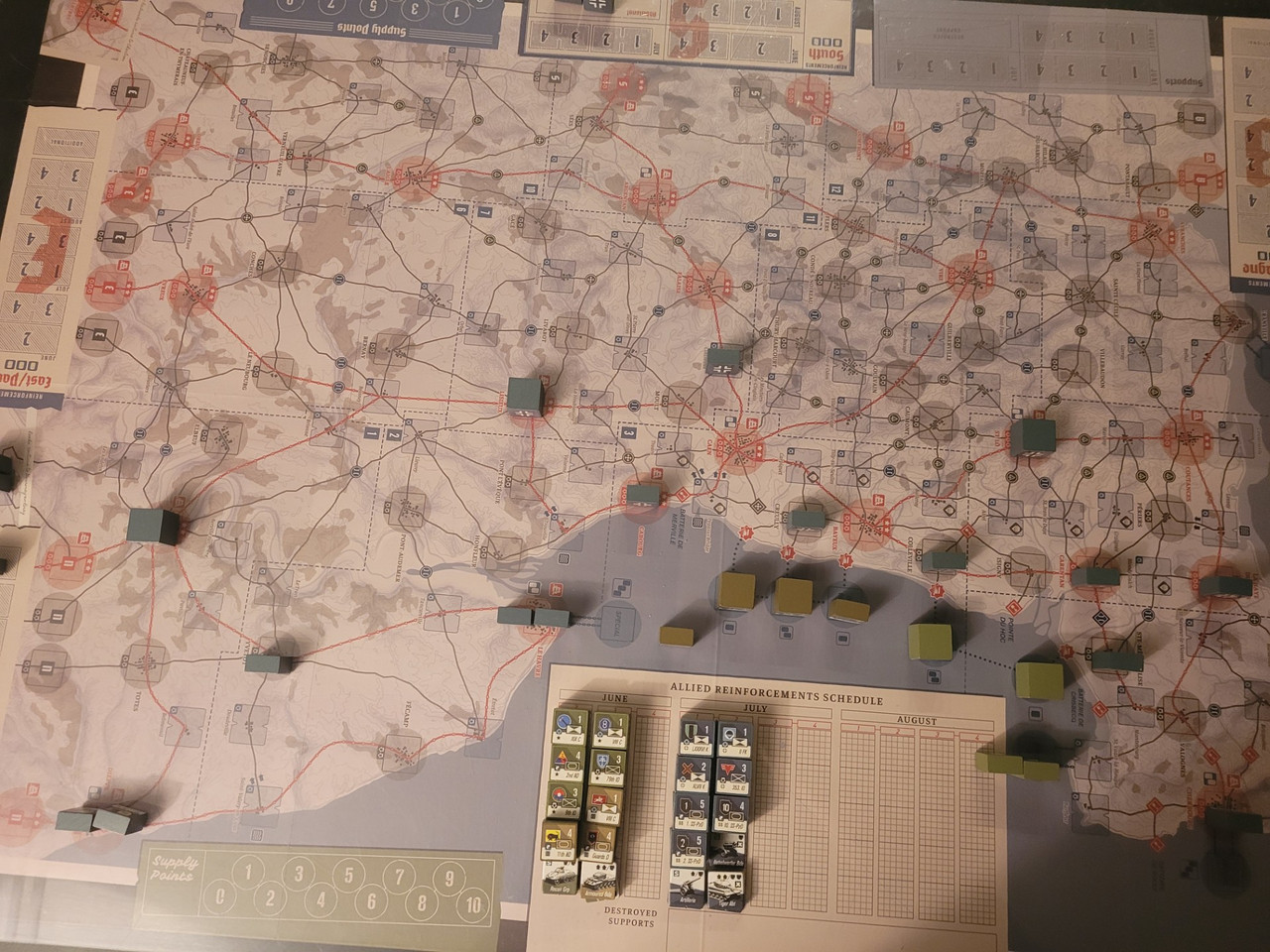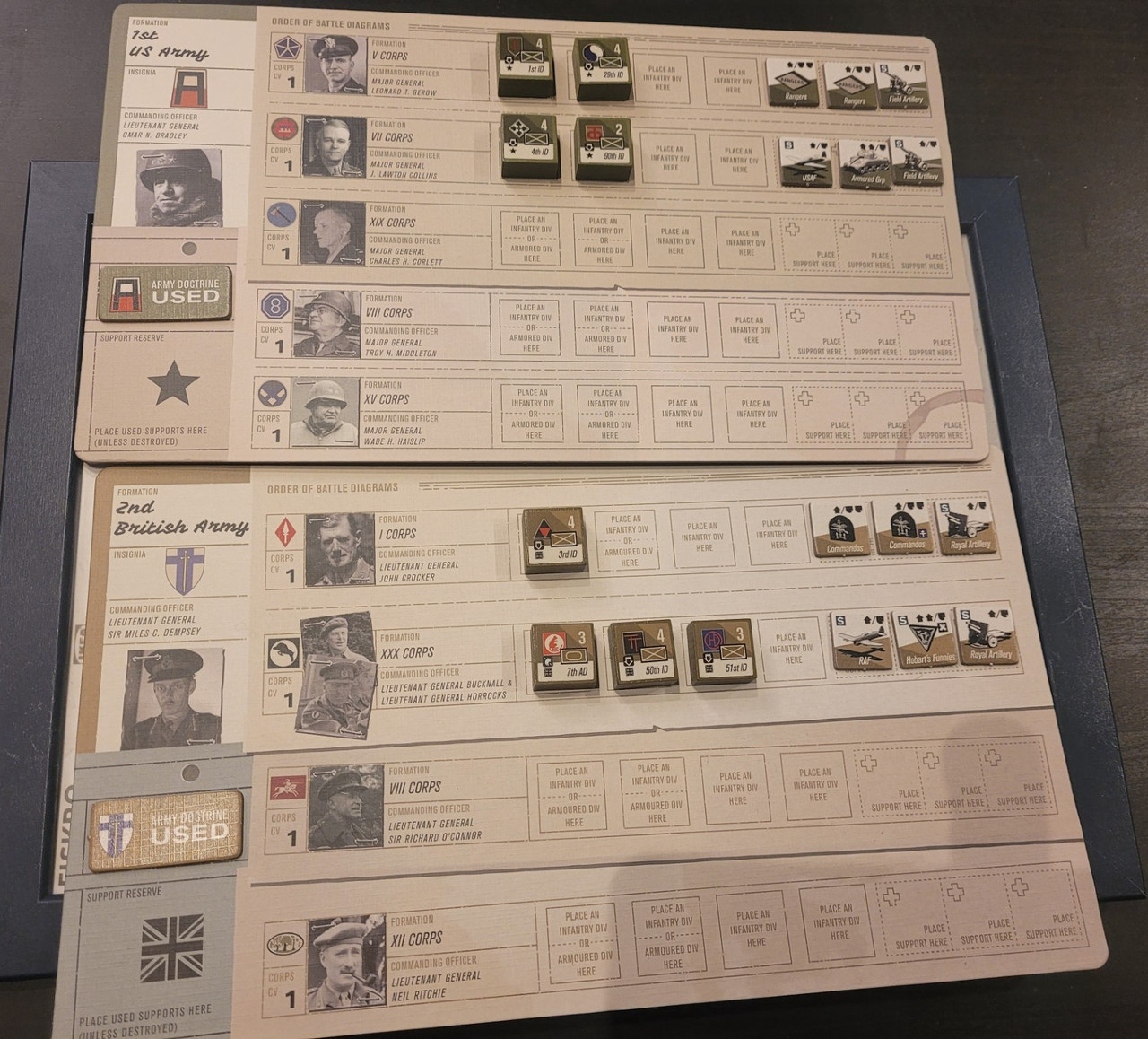 Enheterna är divisioner (normala block) och kår-HQ (stora block). Man vrider inte på blocken, de har istället ett stridsvärde som kan regleras med hjälp av markörer. Divisioner slits ner snarare än plockas bort, jag gillar det. Designern skriver att få tyska divisioner upphörde att existera under sommaren, men att många mot slutet var av tveksamt värde - vilket spelet skildrar. Sedan tillhör varje division en kår (som - håll i er nu - tillhör en armé) och varje kår har olika typer av assets som kan fördelas till olika förband. De olika sidorna har väldigt olika assets (som gör olika saker), de allierade har mer flyg och art, tyskarna har FLAK (oklart varför) och Tigrar och sådant. Jag gillar upplägget med olika resurser på olika nivåer, det lyfts ytterligare av asymmetrin i tilldelandet. Varje armé har också en doktrin som kan begagnas i strid.