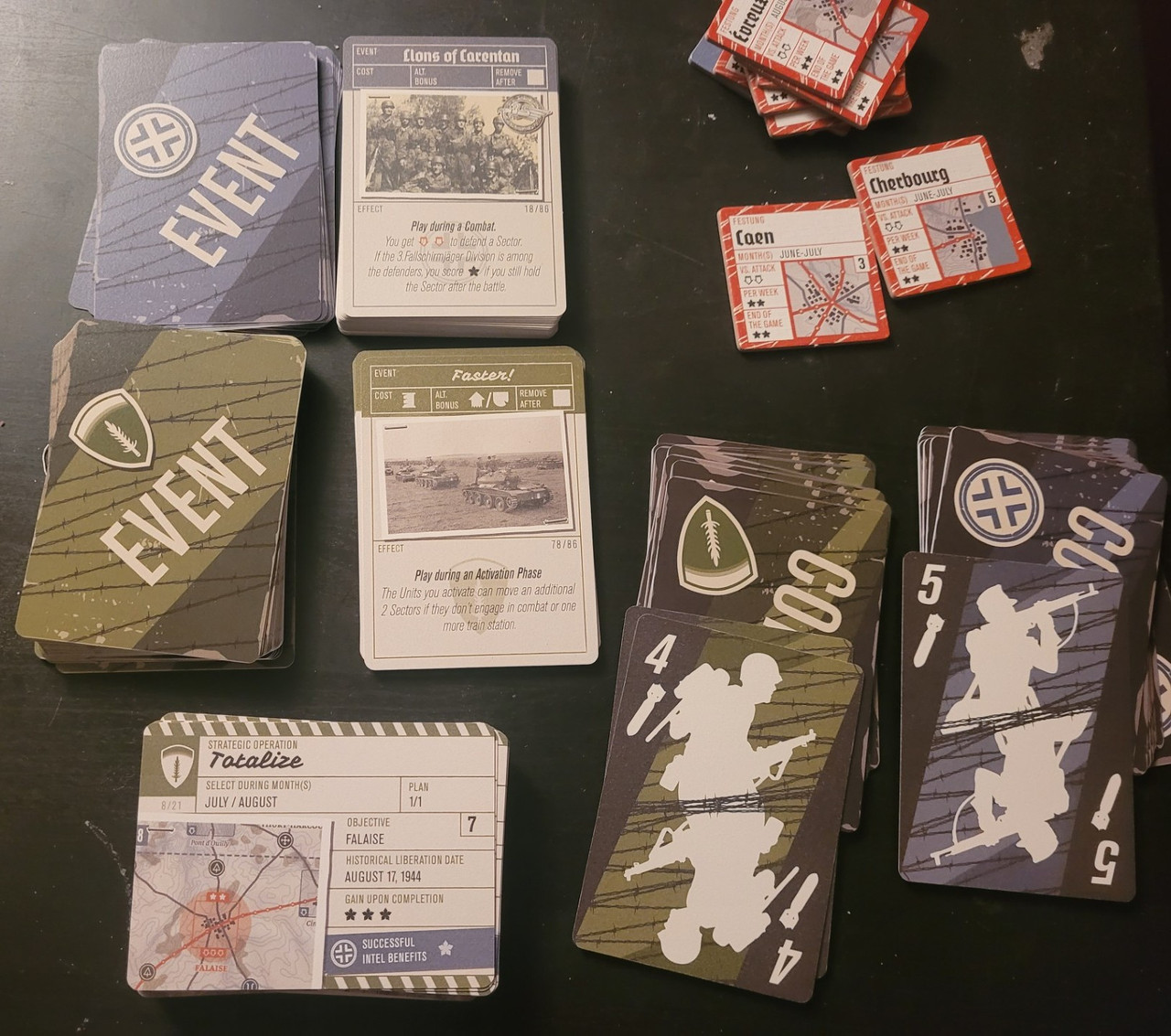 Spelet har också en massa kort med olika funktioner. Dels väljer man strategiska mål för varje månad (vad ska erövras alternativt hållas till sista hiwi),  målen är brickorna uppe till höger och dels har man kortare, operationella mål. Man drar dessutom en massa roliga events och även striderna sköts med kort istället för tärning (olika kort för de olika sidorna).