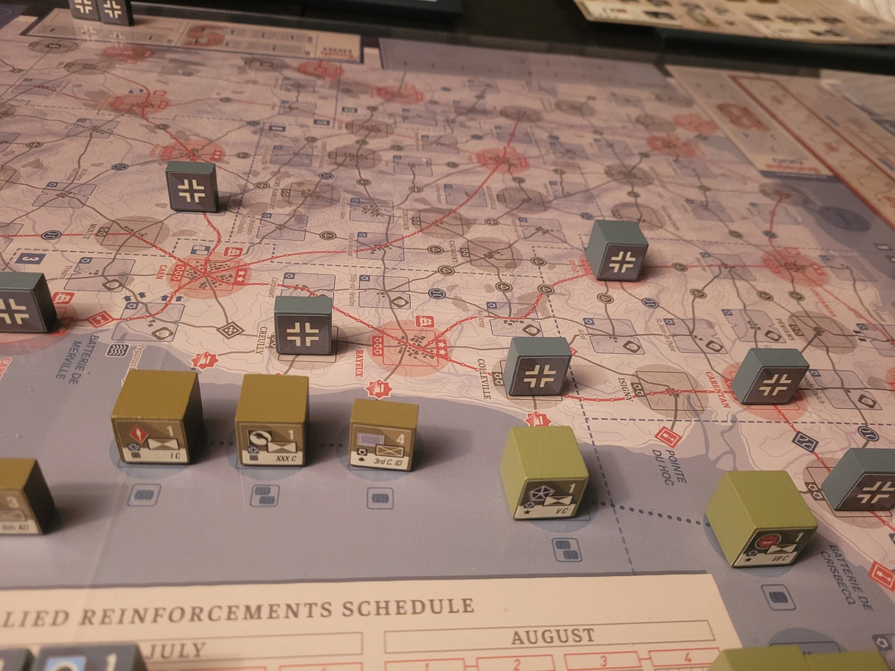 Vuca har med sitt senaste spel lyckats med det ändå anmärkningsvärda konststycket att göra mig sugen på Normandie. Operation Overlord heter spelet, varje block är en division (eller ett kår-HQ) och varje turn är en vecka (spelet går från juni-augusti). Trots ovanstående vanilj så känns det som ett helt nytt grepp på kampanjen, jag tänkte presentera det kortfattat och så snart som möjligt dra igång en replay.